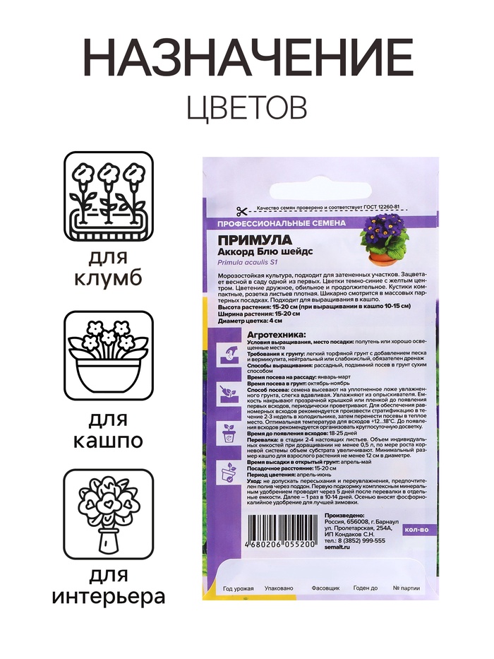 Габариты: 15 x 8 x 0,1 Страна: Россия В боксе: 500 шт Состав: См. на упаковке Материалы: см. на упаковке Фасовка: по 10 шт Индивидуальная упаковка: Без упаковки Сертификат: Не подлежит сертификации Цвет: Фиолетовый Высота, см: 20 Вегетация: Многолетники Вид: Примула Посев на рассаду: Февраль, Январь, Март Посев (посадка) в грунт: Апрель, Май Цветение период: Май, Июнь, Апрель Место выращивания: Универсальный Подходит для балкона: Да Сухоцвет: Нет Махровые: Нет Высота растений: До 30 см По форме куста: Кустовая Назначение: Для создания цветников, клумбы, Для балкона, веранды Отношение к свету: Рассеянный свет Разновидность: Цветущее Нуждаются ли в стратификации: Нет Морозостойкий травянистый двулетник среднераннего срока цветения. Идеально подходит для выращивания в горшечной культуре. Высота растения в горшке 10-15 см, в открытом грунте – 15-20 см. Ширина кустика 15-20 см. Розетка продолговатых светло-зеленых морщинистых листьев служит великолепным фоном. Очаровательные цветки достаточно крупные, в диаметре около 4 см. Групповые посадки из примул отлично смотрятся на каменистых горках, в бордюрах, миксбордерах и рабатках. Эффектно выглядят под деревьями и кустарниками. Комментарии к товару
