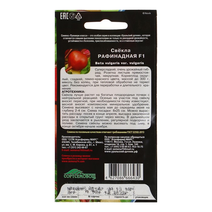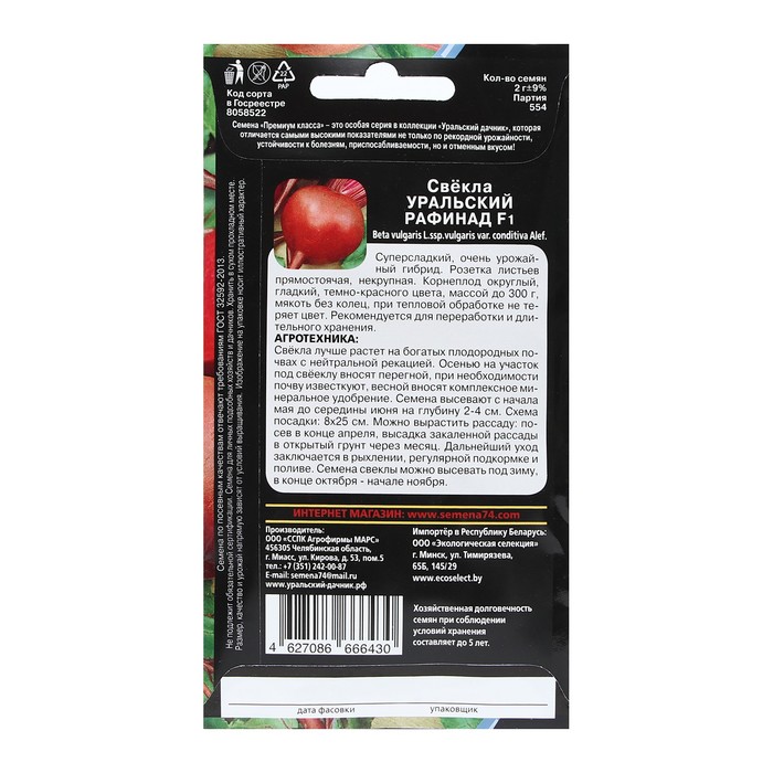 Габариты: 15 x 8 x 0,3 Страна: Россия В боксе: 1000 шт Состав: Семена Материалы: семена Фасовка: по 10 шт Индивидуальная упаковка: Без упаковки Сертификат: Не подлежит сертификации Сроки созревания: Средний Посев (посадка) в грунт: Май, Апрель Упаковка: Цветная Место выращивания: Открытый грунт Сорт или гибрид: Сорт Вегетационный период, дни: 90 - 100 Вид: Простые семена Форма: Круглая Свёкла «Рафинад» — это очень сладкий высокоурожайный гибрид. Гладкий округлый корнеплод тёмно-красного цвета массой до 300 г обладает отличным вкусом и не теряет цвет при тепловой обработке. Свёкла хорошо растёт на богатых почвах с нейтральной реакцией. Посев и уход На рассаду в конце апреля, в грунт — с начала мая до середины июня на глубину 2–4 см по схеме 8 × 25 см. Уход заключается в рыхлении, регулярной подкормке и поливах. Комментарии к товару