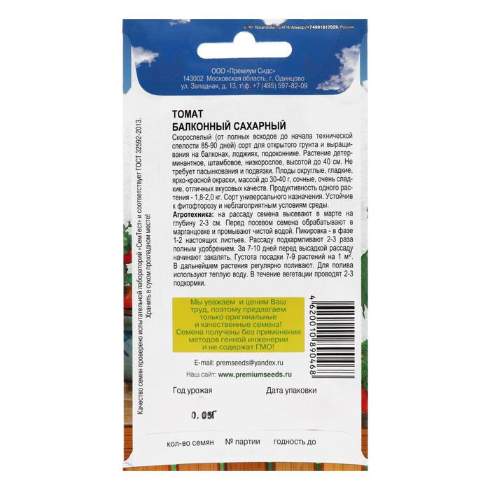 Габариты: 8 x 0,5 x 15 Страна: Россия В боксе: 500 шт Состав: Семена Материалы: семена Фасовка: по 10 шт Индивидуальная упаковка: Без упаковки Габариты товара: 8 см × 0,5 см × 15 см Сертификат: Не подлежит сертификации Цвет: Красный Вид грунта: Открытый Сроки созревания: Сверхранний (скороспелый) Упаковка: Цветная Место выращивания: Открытый грунт, Подоконник, балкон Сорт или гибрид: Сорт Вегетационный период, дни: 87 Тип роста: Супердетерминантный (низкорослый) «Балконный сахарный» — это раннеспелый холодостойкий сорт томатов для выращивания в открытом грунте, а также на балконах, лоджиях и подоконниках. Период от всходов до начала созревания — 85–90 дней. Растение высотой до 40 см имеет гладкие ярко-красные плоды массой 30–40 г. Сорт устойчив к фитофторозу и неблагоприятным условиям среды. Подходит для консервирования, а также для употребления в свежем виде и приготовления салатов. Посев На рассаду в марте на глубину 2–3 см. В открытый грунт помещают после того, как минует угроза заморозков по схеме 7–9 растений на 1 м². Уход Регулярный полив тёплой водой и 2–3 подкормки в период вегетации. Комментарии к товару