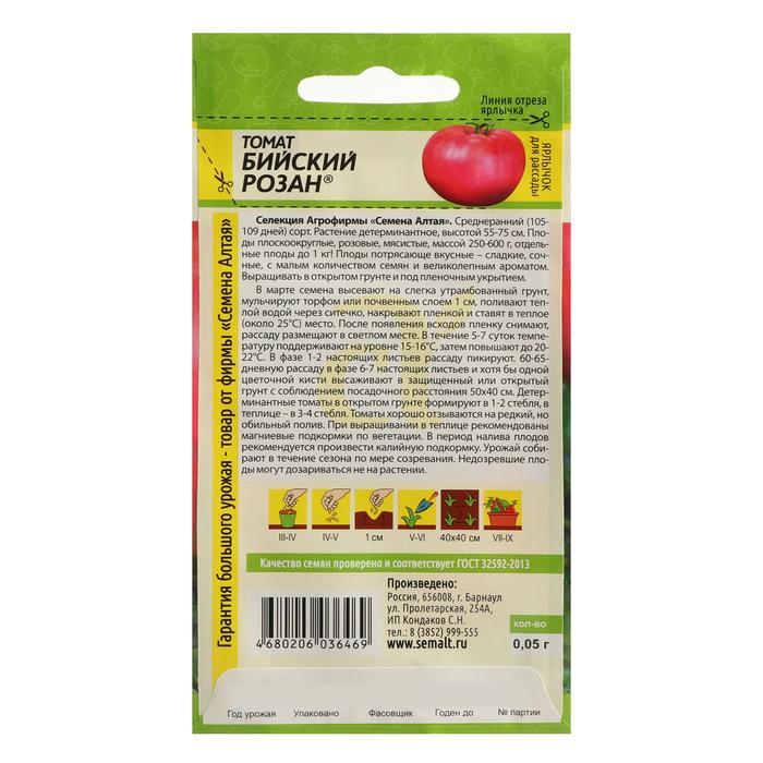 Габариты: 15 x 8 x 0,1 Страна: Россия В боксе: 1000 шт Состав: См. на упаковке Материалы: см. на упаковке Фасовка: по 10 шт Индивидуальная упаковка: Без упаковки Сертификат: Не подлежит сертификации Цвет: Красный Сроки созревания: Средний Место выращивания: Универсальный Сорт или гибрид: Сорт Форма томатов: Круглые Сорт: Бийский Розан Тип роста: Детерминантный (среднерослый) Селекция Агрофирмы «Семена Алтая». Среднеранний (105-109 дней) сорт. Растение детерминантное, высотой 55-75 см. Плоды плоскоокруглые, розовые, мясистые, массой 250-600 г, отдельные плоды до 1кг! Плоды потрясающе вкусные - сладкие, сочные, с малым количеством семян и великолепным ароматом. Выращивать в открытом грунте и под пленочным укрытием. В марте семена высевают на слегка утрамбованный грунт, мульчируют торфом или почвенным слоем 1 см, поливают теплой водой через ситечко, накрывают пленкой и ставят в теплое (около 25°С) место. После появления всходов пленку снимают, рассаду размещают в светлом месте. В течение 5-7 суток температуру поддерживают на уровне 15-16°С, затем повышают до 20-22°С. В фазе 1-2 настоящих листьев рассаду пикируют. 60-65-дневную рассаду в фазе 6-7 настоящих листьев и хотя бы одной цветочной кисти высаживают в защищенный или открытый грунт с соблюдением посадочного расстояния 40х40 см. Детерминантные томаты в открытом грунте формируют в 1-2 стебля, в теплице – в 3-4 стебля. Томаты хорошо отзываются на редкий, но обильный полив. При выращивании в теплице рекомендованы магниевые подкормки по вегетации. В период налива плодов рекомендуется произвести калийную подкормку. Урожай собирают в течение сезона по мере созревания. Недозревшие плоды могут дозариваться не на растении. Комментарии к товару