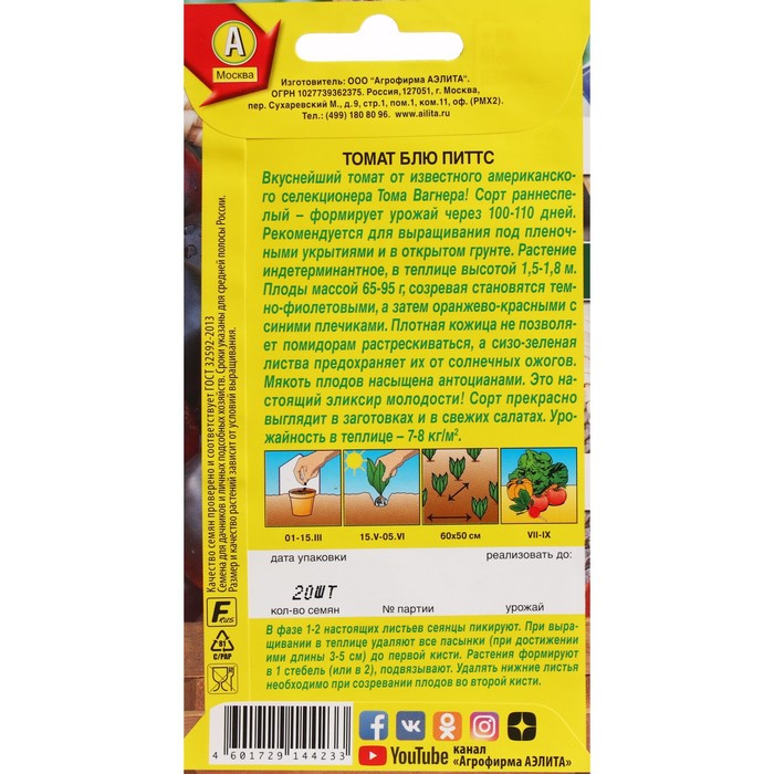 Габариты: 15 x 8 x 0,2 Страна: Россия В боксе: 400 шт Состав: Семена Материалы: семена Фасовка: по 10 шт Индивидуальная упаковка: Без упаковки Сертификат: Не подлежит сертификации Цвет: Фиолетовый Сроки созревания: Ранний Посев на рассаду: Март Место выращивания: Открытый грунт Сорт или гибрид: Сорт Форма томатов: Круглые Применение: Универсальное Вес: Среднеплодные (от 25 до 150 г) Урожайность, м²: 7 - 8 Самый вкусный черри от известного американского селекционера Тома Вагнера! Сорт раннеспелый – формирует урожай через 100-110 суток. Рекомендуется для выращивания под пленочными укрытиями и в открытом грунте. Растение индетерминантное, в теплице высотой 1,5-1,8 м. Плоды массой 65-95 г, созревая становятся темно-фиолетовыми, а затем оранжево -красными с синими плечиками. Плотная кожица не позволяет помидорам растрескиваться, а сизо-зеленая листва предохраняет их от солнечных ожогов. Мякоть плодов насыщена антоцианами. Это настоящий эликсир молодости! Сорт прекрасно выглядит в заготовках и в свежих салатах. Урожайность в теплице – 7-8 кг/м2 . В фазе 1-2 настоящих листьев сеянцы пикируют. При выращивании в теплице удаляют все пасынки (при достиженииими длины 3-5 см) до первой кисти. Растения формируют в 1 стебель (или в 2), подвязывают. Удалять нижние листья необходимо при созревании плодов во второй кисти. Комментарии к товару