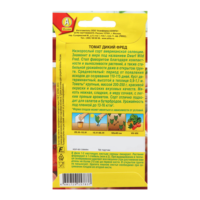 Низкорослый сорт американской селекции. Знаменит в мире под названием Dwarf Wild Fred. Стал фаворитом благодаря компактности и выносливости растений, а также стабильной урожайности даже в открытом грунте. Среднеспелый: период от появления всходов до созревания 110-115 дней. Куст детерминантный, высотой в теплице 0,9-1,1 м. Томаты крупные, массой 200-250 г, красивой окраски и высоких вкусовых качеств. Мякоть нежная, сладкая, в меру сочная, с легким пряным ароматом. Сорт отлично подходит для салатов и бутербродов. Урожайность под пленкой до 13-16 кг/м2.