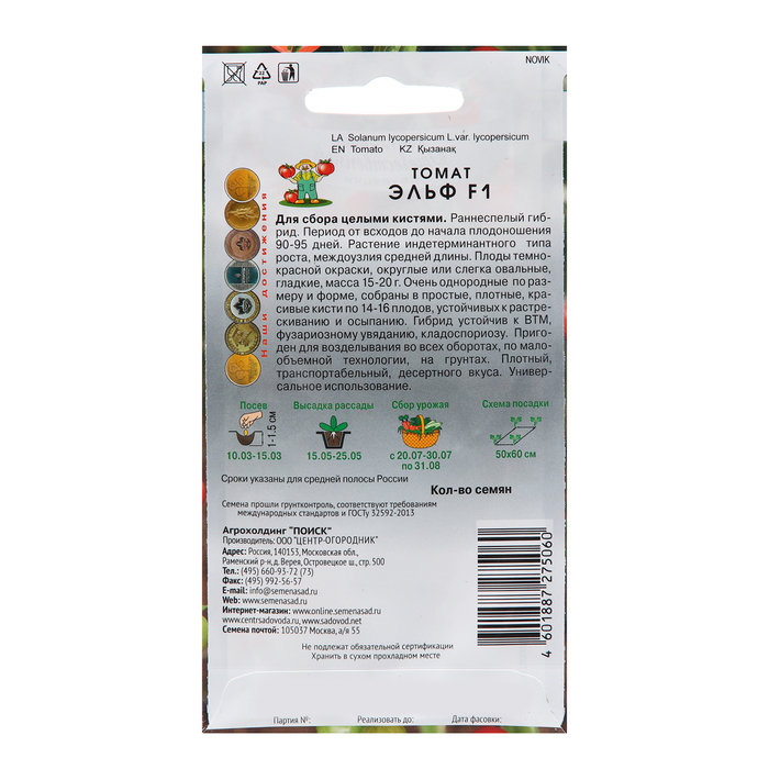 Сорт или гибрид: Гибрид F1 Томат Эльф F1 - раннеспелый, отличные вкусовые качества, пригоден для уборки урожая кистями• Раннеспелый (85-90 дней), компактный габитус, с укороченными междоузлиями• Масса плода 20-25 г• Плоды округлые, гладкие, плотные, собраны в красивую плотную, прочную кистьпо 12-15 штук, пригодны для реализации на подложке• Зрелые плоды темно-красной окраски (ликопин 7,9 мг/100 г), с глянцевым блеском,отличные вкусовые качества• Урожайность 5,5-6,0 кг/м2 (на светокультуре до 15 кг/м2)• Устойчив к ВТМ, фузариозному увяданию, кладоспориозу, растрескиванию иосыпанию;• Рекомендуется для потребления в свежем виде и цельноплодного консервирования