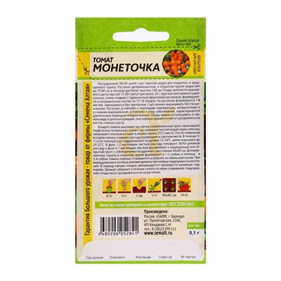 Габариты: 15 x 8 x 0,1 Страна: Россия В боксе: 1000 шт Состав: См. на упаковке Материалы: см. на упаковке Фасовка: по 10 шт Индивидуальная упаковка: Без упаковки Сертификат: Не подлежит сертификации Цвет: Оранжевый Сроки созревания: Ранний Место выращивания: Универсальный Сорт или гибрид: Сорт Тип роста: Детерминантный (среднерослый) Ультраранний (80-85 дней)сорт томатов-черри для открытого и защищенного грунта. Растение детерминантное, в открытом грунте вырастает до 70-80 см, в теплице достигает высоты 120 см. Плоды золотисто-оранжевого цвета, массой 15-20 г, могут достигать 35 г, круглые или немного удлиненные, очень сладкие с гармоничной фруктовой кислинкой, формируются в неправильных кистях по 15-18 плодов. На растении формируется 7-8 кистей, завязываются без пропусков. Сорт можно выращивать без пасынкования. Растение устойчиво к перепадам температуры, неприхотливо к условиям выращивания, устойчиво к ряду заболеваний, характеризуется длительным периодом плодоношения. Плоды можно использовать в свежем виде и для консервации, они хорошо хранятся и могут дозариваться в кистях, снятых с куста. Комментарии к товару