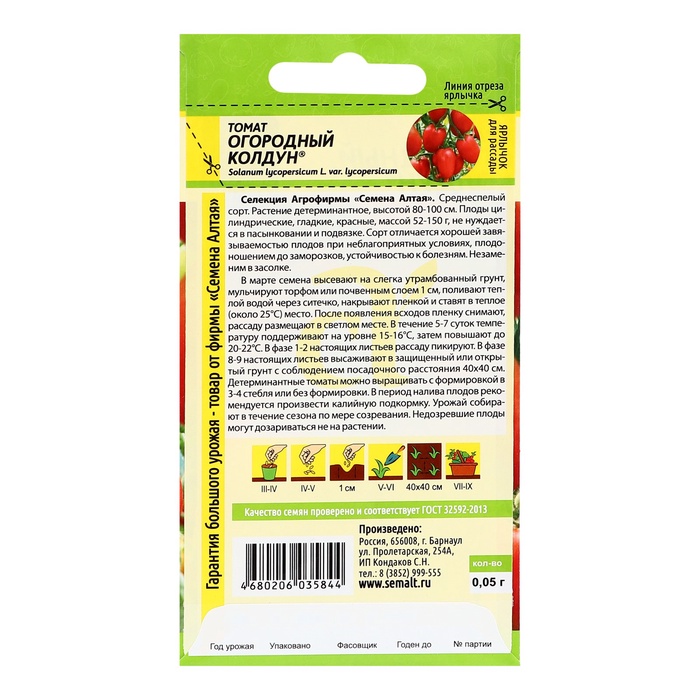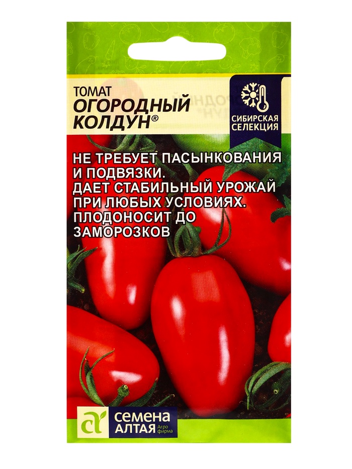 Габариты: 15 x 8 x 0,1 Страна: Россия В боксе: 1000 шт Состав: См. на упаковке Материалы: см. на упаковке Фасовка: по 10 шт Индивидуальная упаковка: Без упаковки Сертификат: Не подлежит сертификации Цвет: Красный Сроки созревания: Средний Место выращивания: Универсальный Сорт или гибрид: Сорт Форма томатов: Сливовидные Сорт: Огородный Колдун Тип роста: Детерминантный (среднерослый) Селекция Агрофирмы «Семена Алтая». Среднеспелый сорт. Растения детерминантное, высотой 80-100 см. Плоды цилиндрические, гладкие, красные, массой 52-150 г, не нуждается в пасынковании и подвязке. Сорт отличается хорошей завязываемостью плодов при неблагоприятных условиях, плодоношением до заморозков, устойчивостью к болезням. Незаменим в засолке. В марте семена высевают на слегка утрамбованный грунт, мульчируют торфом или почвенным слоем 1,0 см, поливают теплой водой через ситечко, накрывают пленкой и ставят в теплое (около 25°С) место. После появления всходов пленку снимают, рассаду размещают в светлом месте. В течение 5-7 суток температуру поддерживают на уровне 15-16°С, затем повышают до 20-22°С. В фазе 1-2 настоящих листьев рассаду пикируют. 60-65-дневную рассаду в фазе 6-7 настоящих листьев и хотя бы одной цветочной кисти высаживают в защищенный или открытый грунт. Комментарии к товару