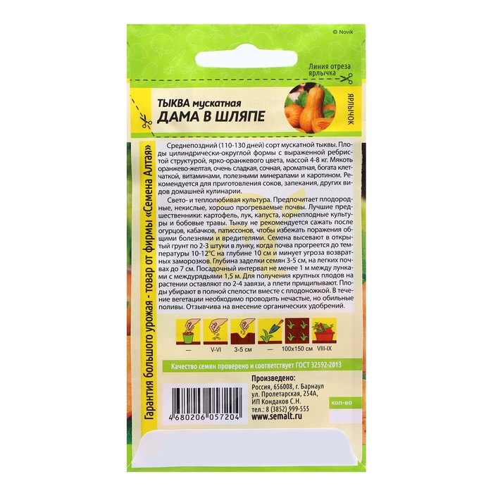 Габариты: 15 x 8 x 0,2 Страна: Россия В боксе: 600 шт Состав: См. на упаковке Материалы: см. на упаковке Фасовка: по 10 шт Индивидуальная упаковка: Без упаковки Сертификат: Не подлежит сертификации Сроки созревания: Среднепоздний Посев (посадка) в грунт: Июнь, Май Место выращивания: Открытый грунт Сорт или гибрид: Сорт Цвет плода: Оранжевый Вес: Средние (от 4 до 6 кг), Крупные (от 6 до 10 кг) Среднепоздний (110-130 дней) сорт мускатной тыквы. Плоды цилиндрически-округлой формы с выраженной ребристой структурой, ярко-оранжевого цвета, массой 4-8 кг. Мякоть оранжево-желтая, очень сладкая, сочная, ароматная, богата клетчаткой, витаминами, полезными минералами и каротином.Рекомендуется для приготовления соков, запекания, других видов домашней кулинарии. Комментарии к товару