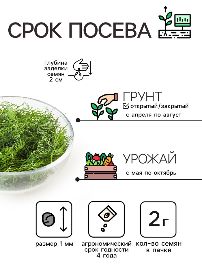 — Размер или масса плода: Укроп не образует плодов в привычном понимании, семена имеют округлую форму и размер около 3-5 мм.