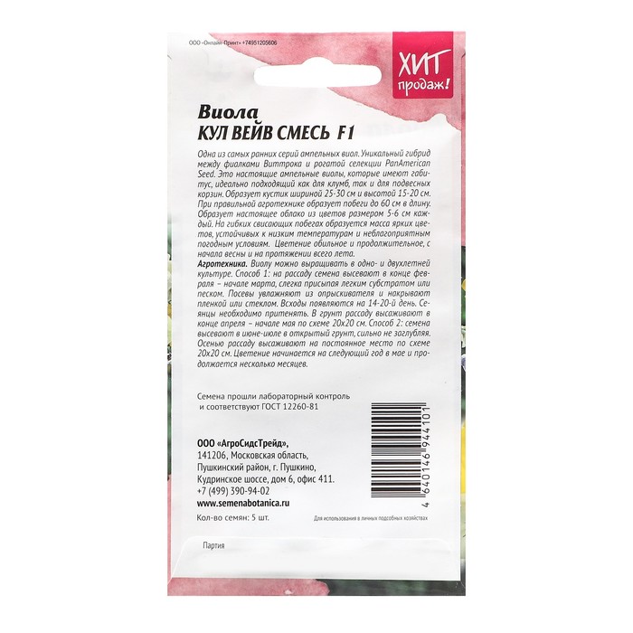 Габариты: 15 x 8 x 0,2 Страна: Китай В боксе: 100 шт Состав: См. на упаковке Материалы: см. на упаковке Фасовка: по 10 шт Индивидуальная упаковка: Без упаковки Сертификат: Не подлежит сертификации Цвет: Разноцветный Высота, см: 35 - 50 Вегетация: Многолетники Вид: Виола Посев на рассаду: Февраль, Март Посев (посадка) в грунт: Апрель, Май Цветение период: Август, Июль, Апрель, Май, Июнь Место выращивания: Открытый грунт Подходит для балкона: Да Сухоцвет: Нет Махровые: Нет Высота растений: До 30 см По форме куста: Кустовая Назначение: Для балкона, веранды, Для создания цветников, клумбы Отношение к свету: Светолюбивые Разновидность: Цветущее Нуждаются ли в стратификации: Нет Одна из самых ранних серий ампельных виол. Уникальный гибрид между фиалками Виттрока и рогатой селекции PanAmerican Seed. Это настоящие ампельные виолы, которые имеют габитус, идеально подходящий как для клумб, так и для подвесных корзин. Образует кустик шириной 25-30 см и высотой 15-20 см. При правильной агротехнике образует побеги до 60 см в длину. Образует настоящее облако из цветов размером 5-6 см каждый. На гибких свисающих побегах образуется масса ярких цветов, устойчивых к низким температурам и неблагоприятным погодным условиям. Цветение обильное и продолжительное, с начала весны и на протяжении всего лета. Агротехника. Виолу можно выращивать в одно- и двухлетней культуре. Способ 1: на рассаду семена высевают в конце февраля - начале марта, слегка присыпая легким субстратом или песком. Посевы увлажняют из опрыскивателя и на и нокрывают пленкой или стеклом. Всходы появляются на 14-20-й день. Сеянцы необходимо притенять. В грунт рассоду высаживают в конце апреля - начале мая по схеме 20х20 см. Способ 2: семена высевают в июне-июле в открытый грунт, сильно не заглубляя. Осенью рассаду высаживают на постоянное место по схеме 20х20 см. Цветение начинается на следующий год в мае и продолжается несколько месяцев. Комментарии к товару
