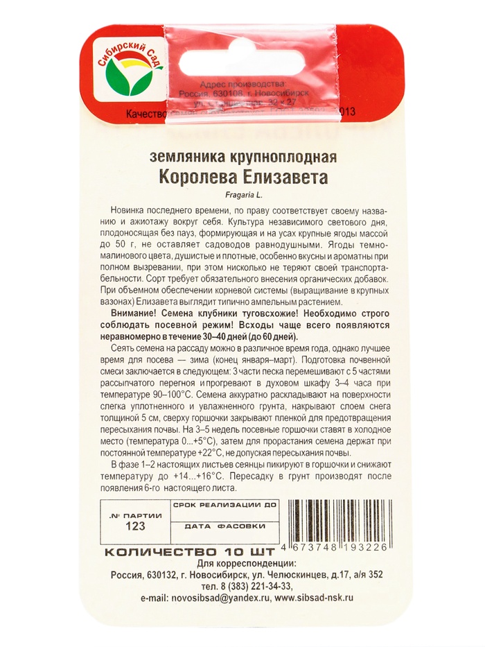 Габариты: 15 x 8 x 0,1 Страна: Россия В боксе: 1000 шт Состав: Семена Материалы: семена Фасовка: по 10 шт Индивидуальная упаковка: Без упаковки Сертификат: Не подлежит сертификации Цвет: Красный Высота, см: 15 - 25 Сроки созревания: Ранний Посев на рассаду: Апрель, Март, Январь, Февраль Посев (посадка) в грунт: Июнь, Май Цветение период: Июль, Июнь Упаковка: Цветная Место выращивания: Универсальный Урожай: Июнь - Июль, Август - Сентябрь Нуждаются ли в стратификации: Да "Новинка последнего времени, по праву соответствует своему названию и ажиотажу вокруг себя. Культура независимого светового дня, плодоносящая без пауз, формирующая и на усах крупные ягоды массой до 50 г, не оставляет садоводов равнодушными. Ягоды темно-малинового цвета, душистые и плотные, особенно вкусны и ароматны при полном вызревании, при этом нисколько не теряют своей транслортабельности. Сорт требует обязательного внесения органических добавок. При объемном обеспечении корневой системы (выращивание в крупных вазонах) Елизавета выглядит типично ампельным растением. Внимание! Семена клубники туговсхожие! Необходимо строго соблюдать посевной режим! Всходы чаще всего появляются неравномерно в течение 30-40 дней (до 60 дней). Сеять семена на рассаду можно в различное время года, однако лучшее время для посева - зима (конец января - март). Подготовка почвенной смеси заключается в следующем: 3 части песка перемешивают с 5 частями рассыпчатого перегноя и прогревают в духовом шкафу 3-4 часа при температуре 90-100°С. Семена аккуратно раскладывают на поверхности слегка уплотненного и увлажненного грунта, накрывают слоем снега толщиной 5 см, сверху горшочки закрывают пленкой для предотвращения пересыхания почвы. На 3-5 дней посевные горшочки ставят в холодное место (температура 0...+5°C), затем для прорастания семена держат при постоянной температуре +22°С, не допуская пересыхания почвы. В фазе 1 -2 настоящих листьев сеянцы пикируют в горшочки и снижают температуру до +14...+16°С. Пересадку в грунт производят после появления 6-го настоящего листа." Комментарии к товару
