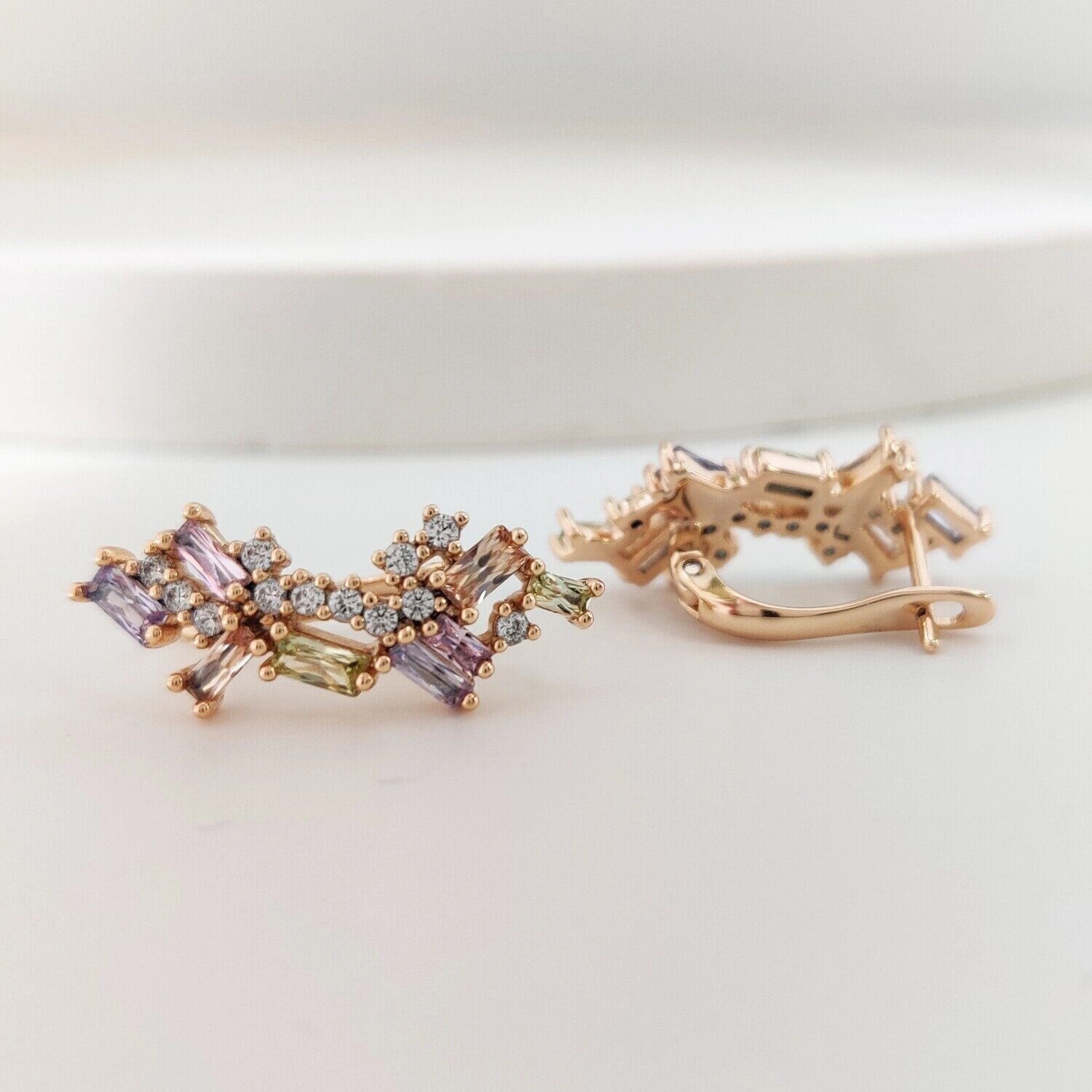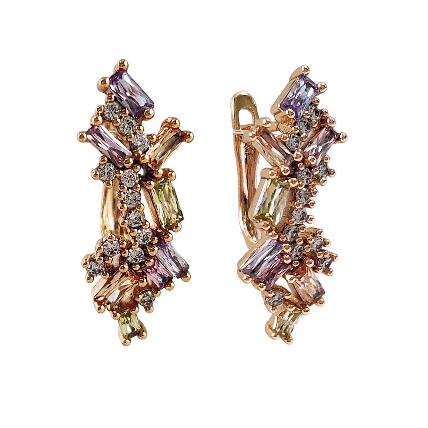 Вставка: Цирконы Материал изделия: ювелирный сплав Размер: - 2.5 см Вид(модель) сережек: Английский замочек Красивые серьги с благородными цирконами изготовлены из специального гипоаллергенного ювелирного сплава