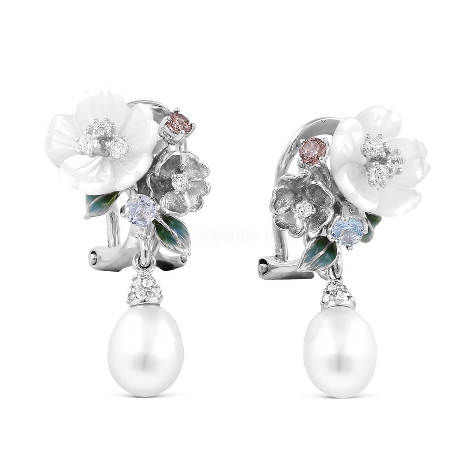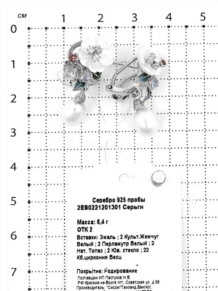 Серьги из родир.серебра с культ.жемчугом,перламутром,нат.топазом,юв.стеклом,эмалью и кб.цирконием 925 пробы 2ES0221201301