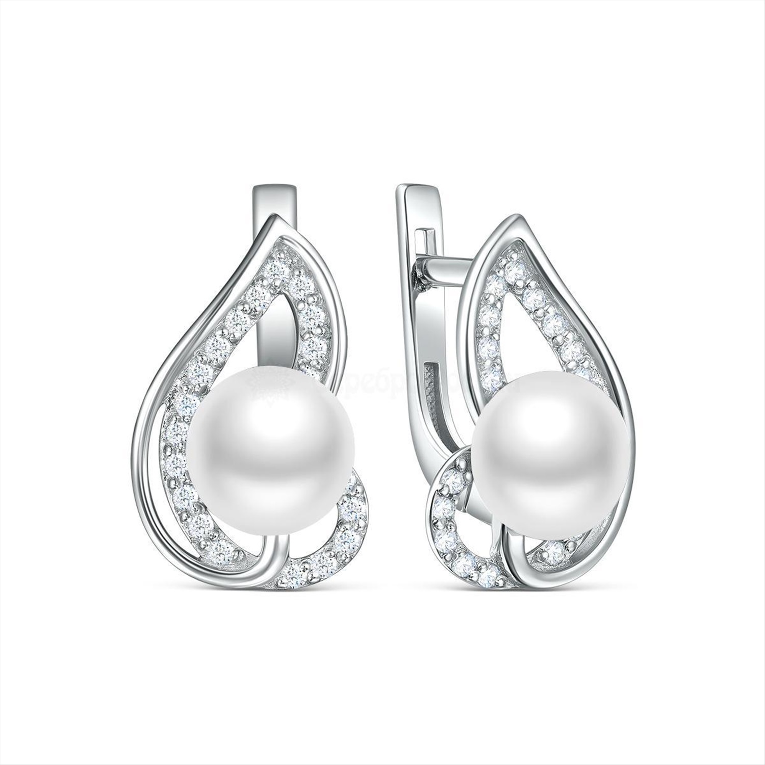 Серьги из серебра с культивированным жемчугом и фианитами родированные 925 пробы См042р1005