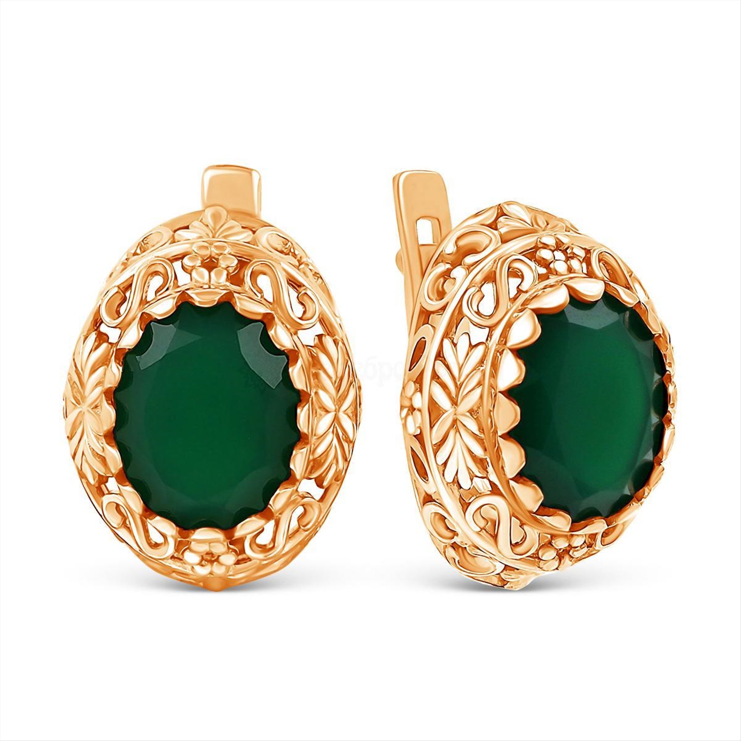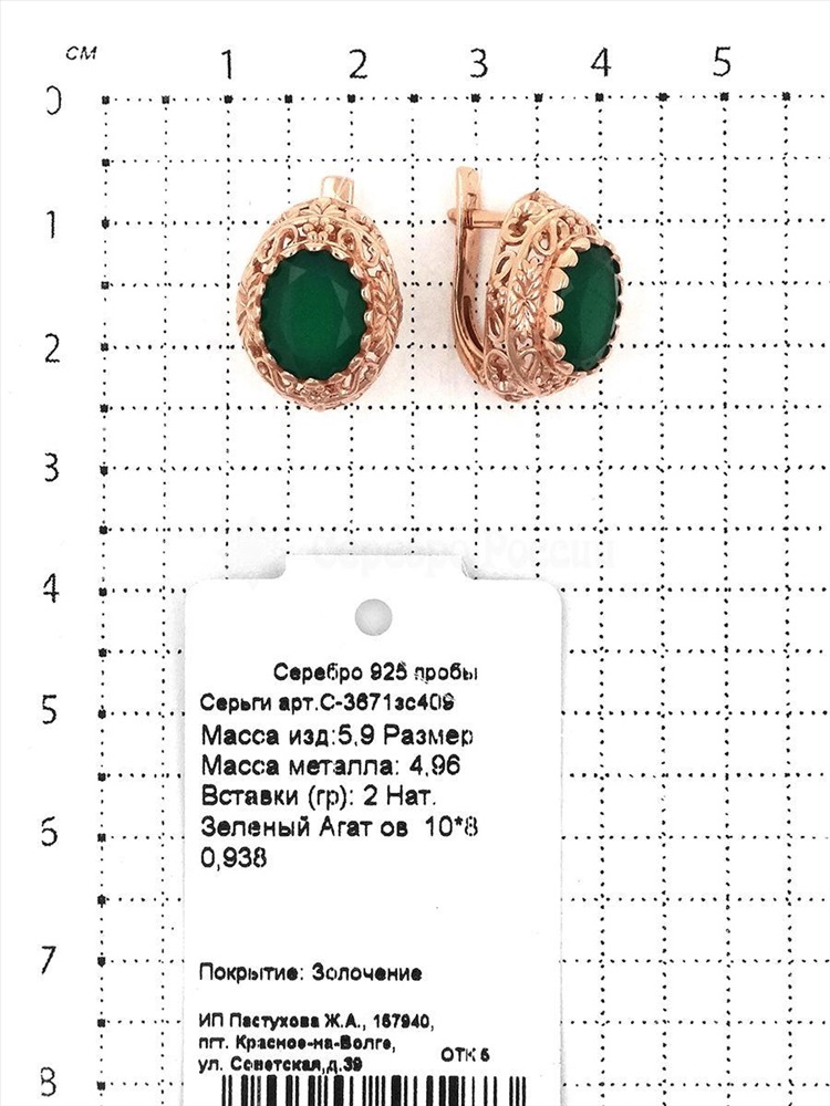 Серьги из золочёного серебра с нат.зелёным агатом 925 пробы С-3671зс409