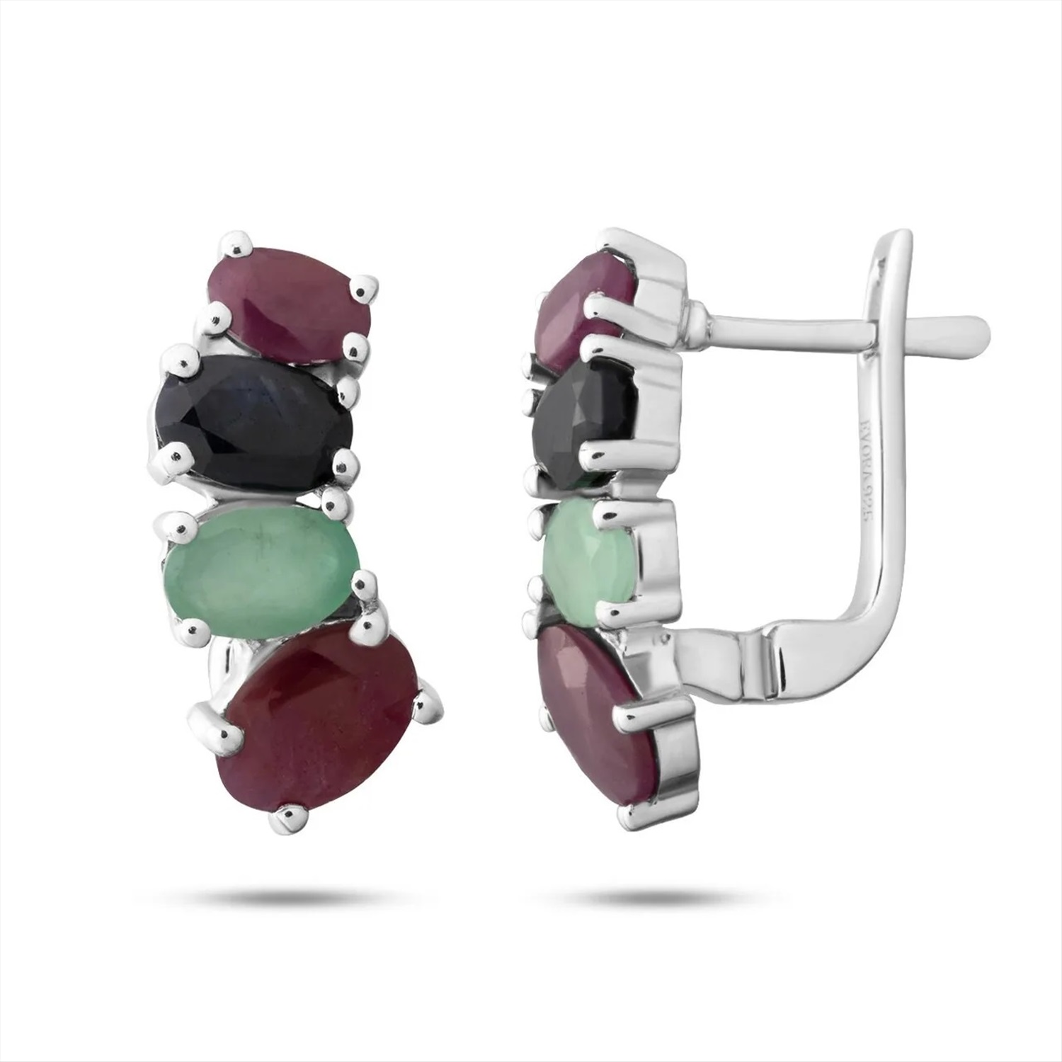 Вставка: Миксы Производство: Индия Покрытие: Родирование Ячейка: 1.A.15.01 Стиль: Английский замок Количество: 3 Серьги, арт.653304 Серебро Серебро 925, 4,23 гр., изумруд берилл , рубин корунд , сапфир корунд Комментарии к товару