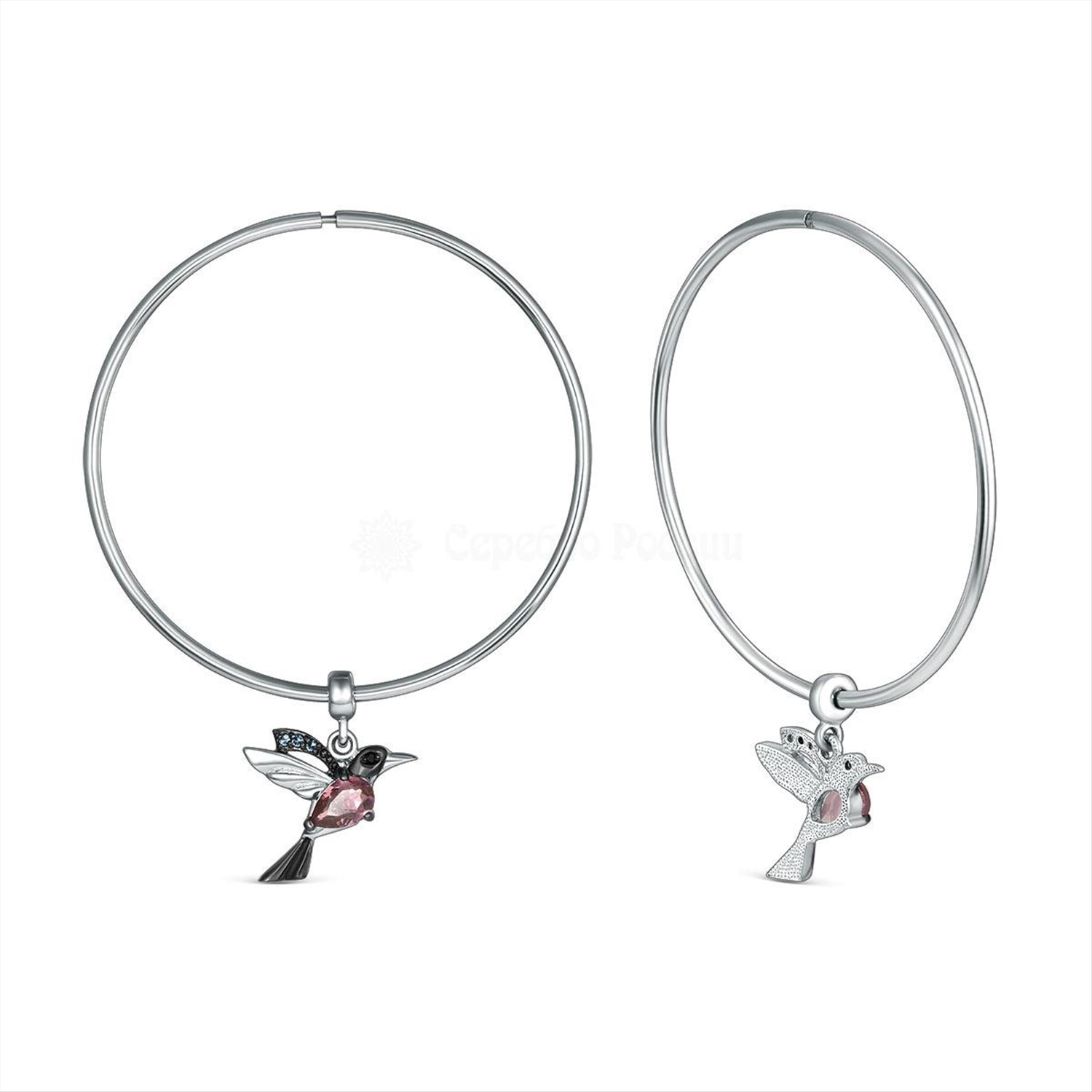 Серьги-конго из серебра с плавленым кварцем цвета родолит, лондон топаз, чёрный, родированные - Птички, Трансформеры (2 в 1) 925 пробы Кн-040р110