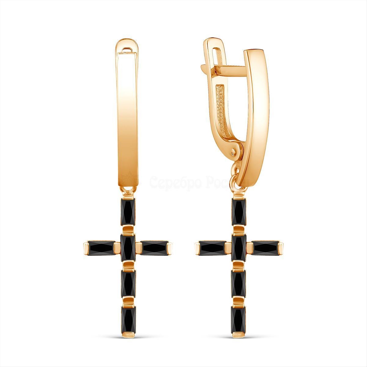 Серьги кресты из золочёного серебра с черными фианитами 925 пробы 421-20-514з-216
