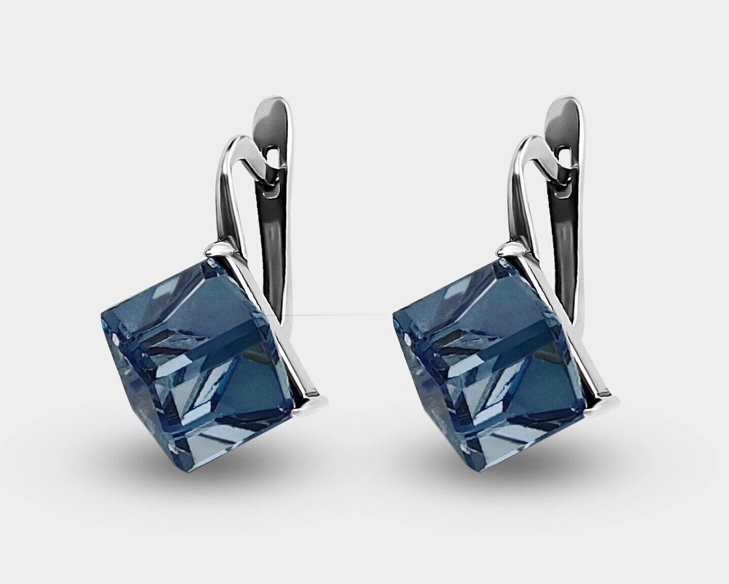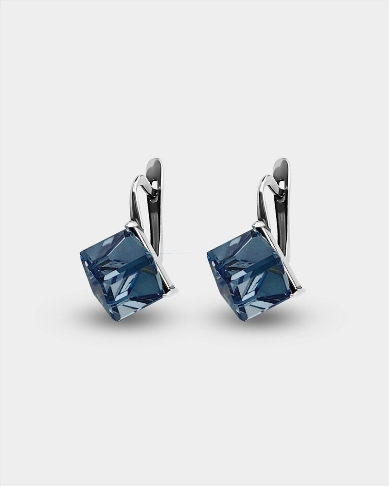 Вставка: стразы Preciosa Материал изделия: покрыто серебром 999 пробы Размер: 2.2 смРазмер кубика 8 мм Цвет кристалла: Denim Blue Серьги изготовлены из специального гипоаллергенного ювелирного сплава, покрыто серебром высшей 999 пробы.