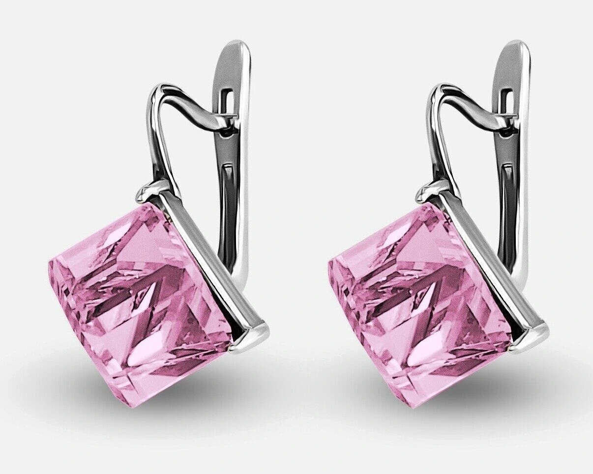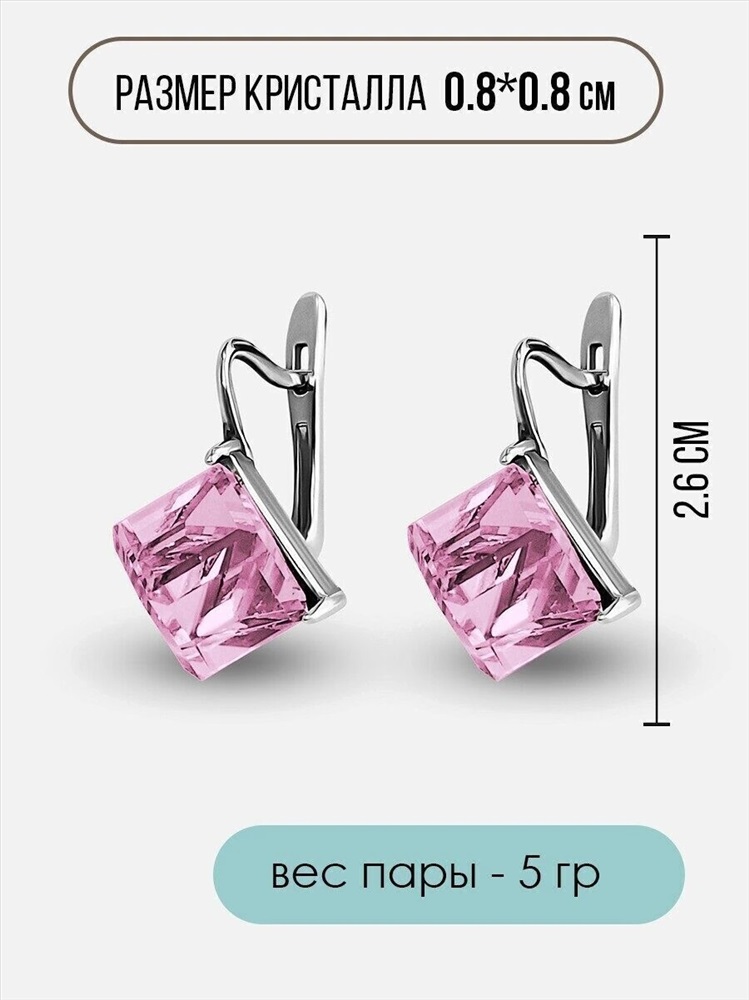Вставка: стразы Preciosa Материал изделия: покрыто серебром 999 пробы Размер: 2.2 смРазмер кубика 8 мм Цвет кристалла: Light Rose Серьги изготовлены из специального гипоаллергенного ювелирного сплава, покрыто серебром высшей 999 пробы.