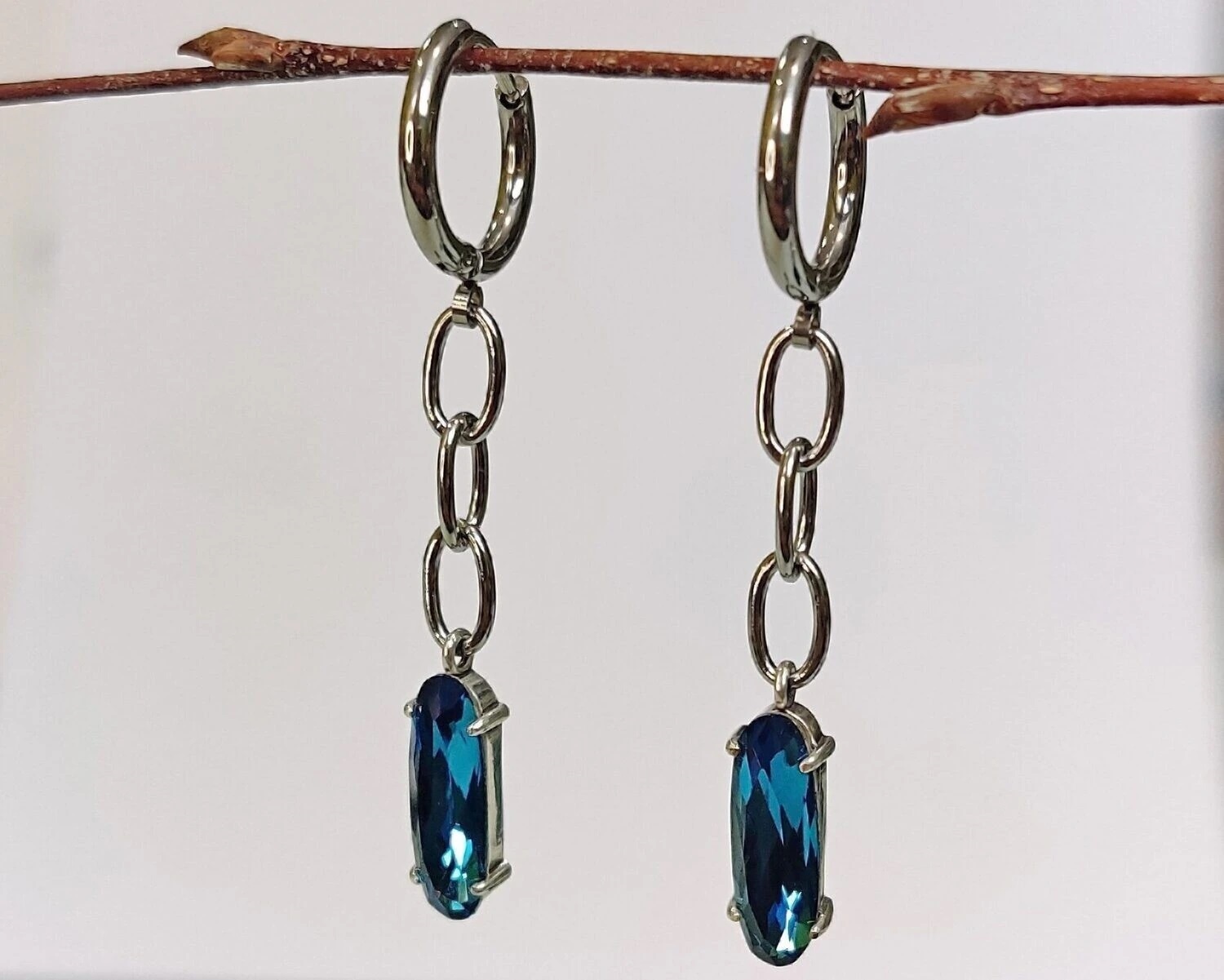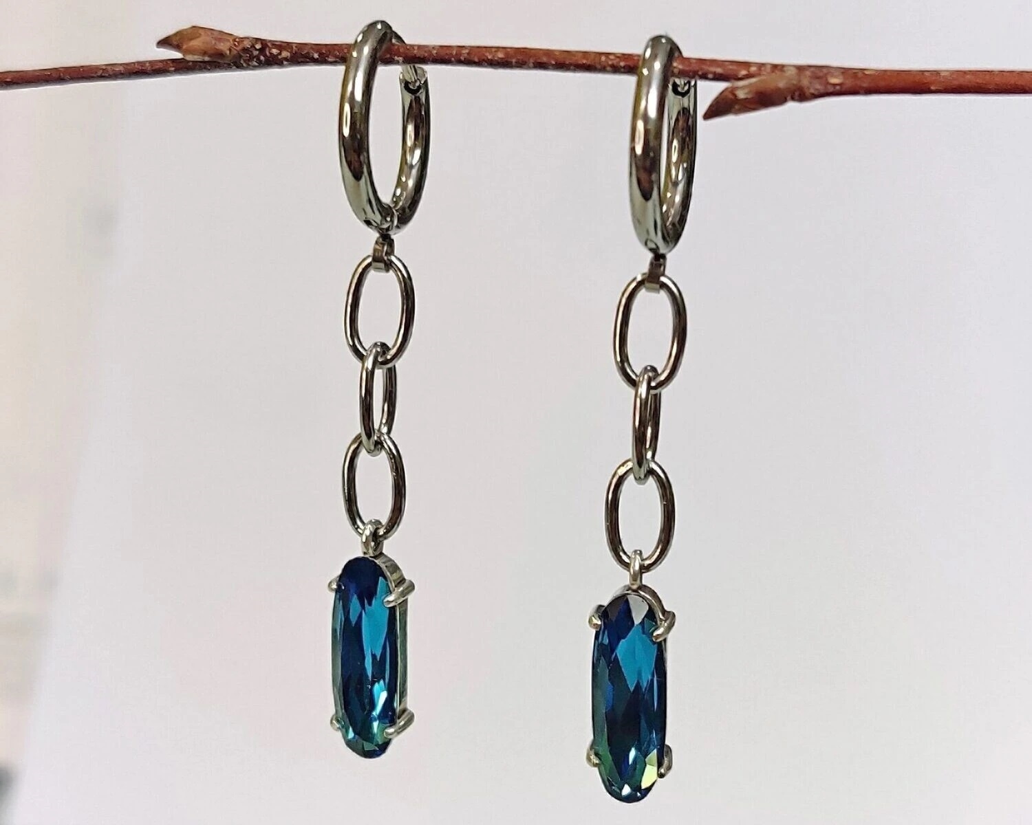 Вставка: кристалл Preciosa Материал изделия: ювелирный сплав Размер: 4.7 см Цвет кристалла: Montana Серьги изготовлены из специального гипоаллергенного ювелирного сплава, покрыто серебром высшей 999 пробы. Для вставки используются кристалл Preciosa