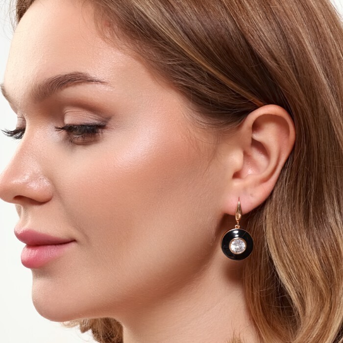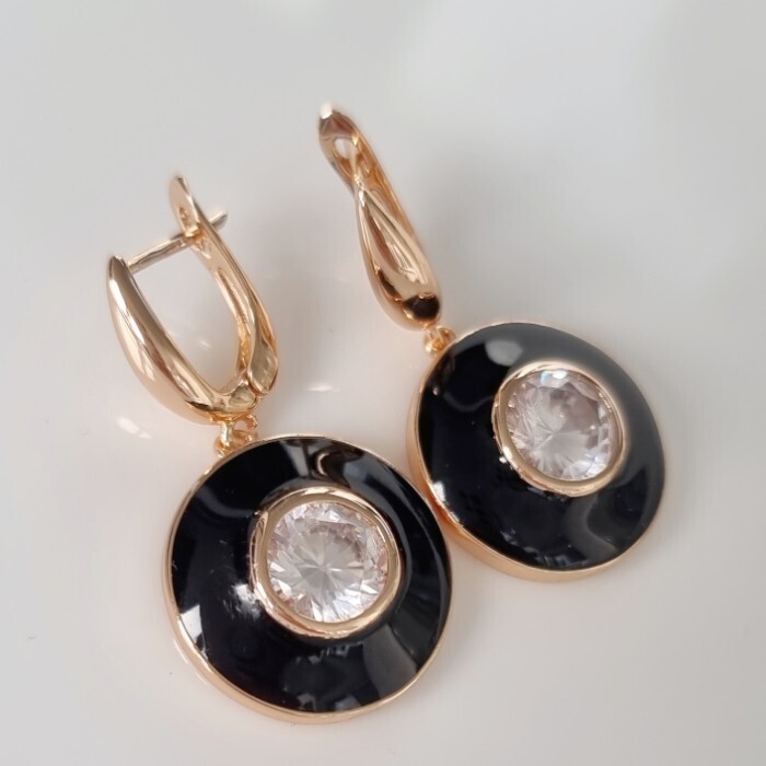 Серьги подвески ювелирная бижутерия коллекция "Дубай" покрытие позолота, вставка: цветная эмаль и крупный фианит, цвет: прозрачный и черный, арт.215.349