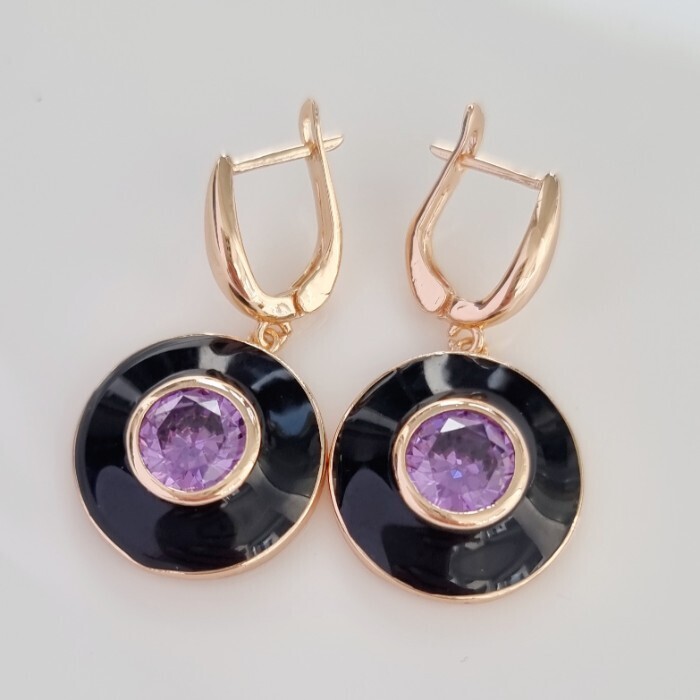 Серьги подвески ювелирная бижутерия коллекция "Дубай" покрытие позолота, вставка: цветная эмаль и крупный фианит, цвет: фиолетовый и черный, арт.215.348