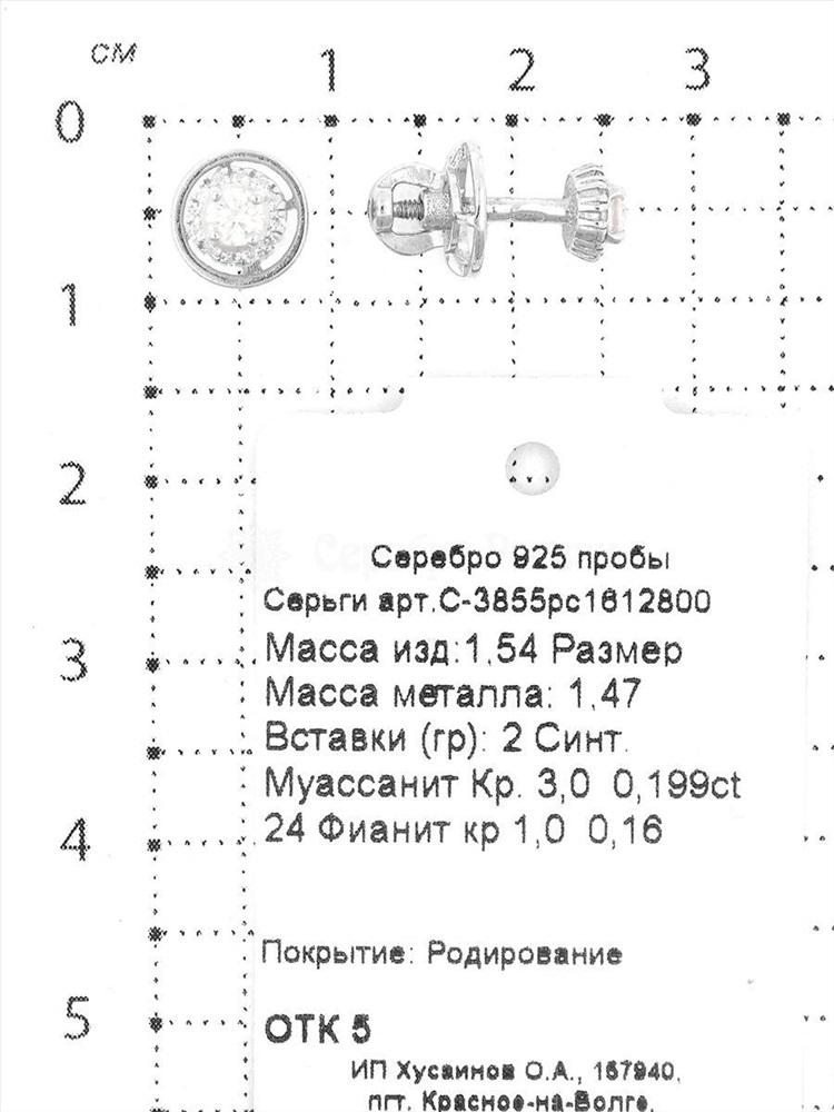 Серьги-пусеты из серебра с синт. муассанит и фианитами родированные 925 пробы С-3855рс1612800