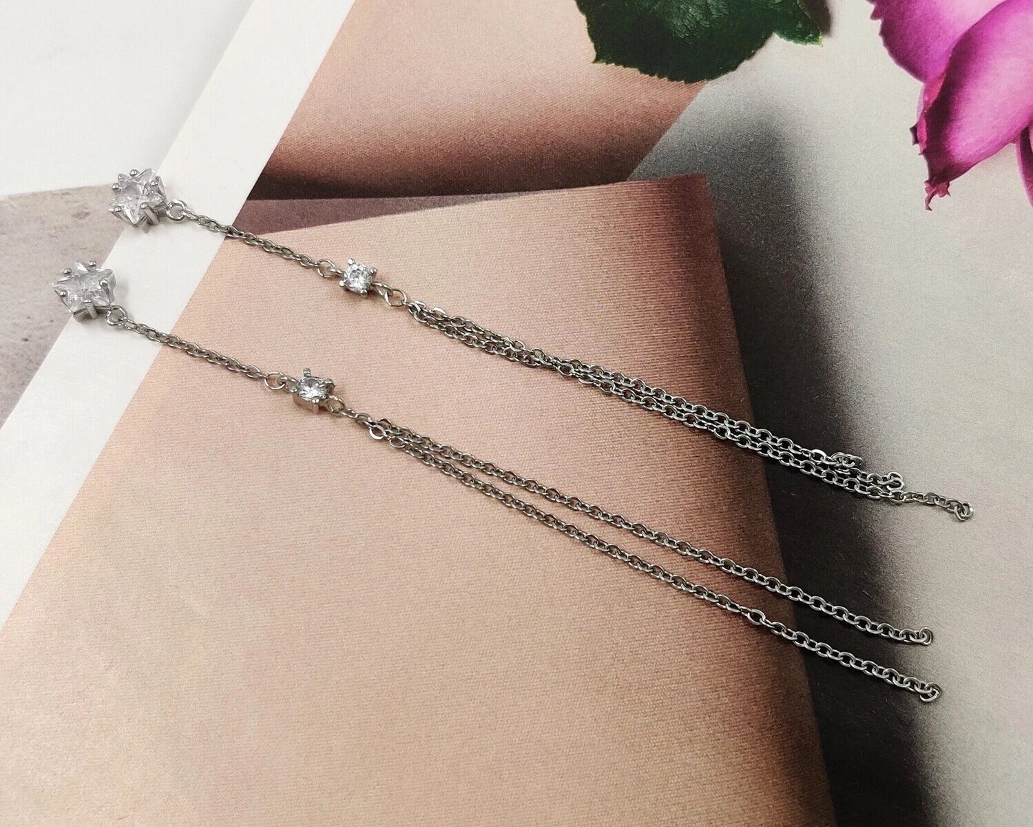 Вставка: Цирконы Материал изделия: ювелирный сплав Размер: 9.5 см Красивые серьги из специального ювелирного сплава, который покрыты устойчивым покрытием, предотвращающим раздражение кожных покровов.
