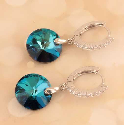 Серьги с покрытием родий. Материал: бижутерный сплав. Покрытие: родий. Вставки: австрийские кристаллы. Размер серьги: 3 см. Размер камня: 1,2 см. Цвет камня: морская волна.