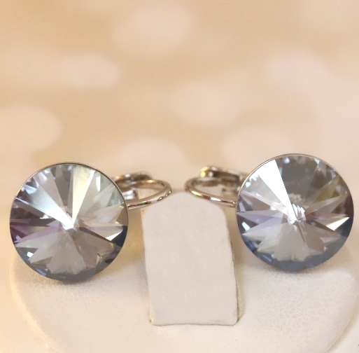 Серьги с покрытием родий Материал: бижутерный сплав. Покрытие: родий. Вставка: австрийские кристаллы. Размер серьги: 1,9 см. Размер камня: 1,2 см Цвет камня: серо-голубой.