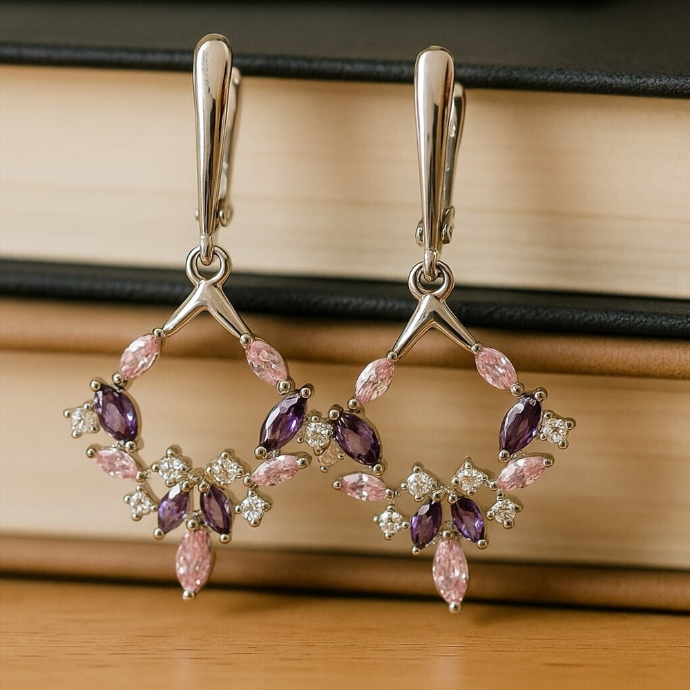 Серьги ювелирная бижутерия коллекция "Дубай" покрытие посеребрение, вставка: фианиты, цвет: прозрачный, сиреневый и розовый, арт.007.165