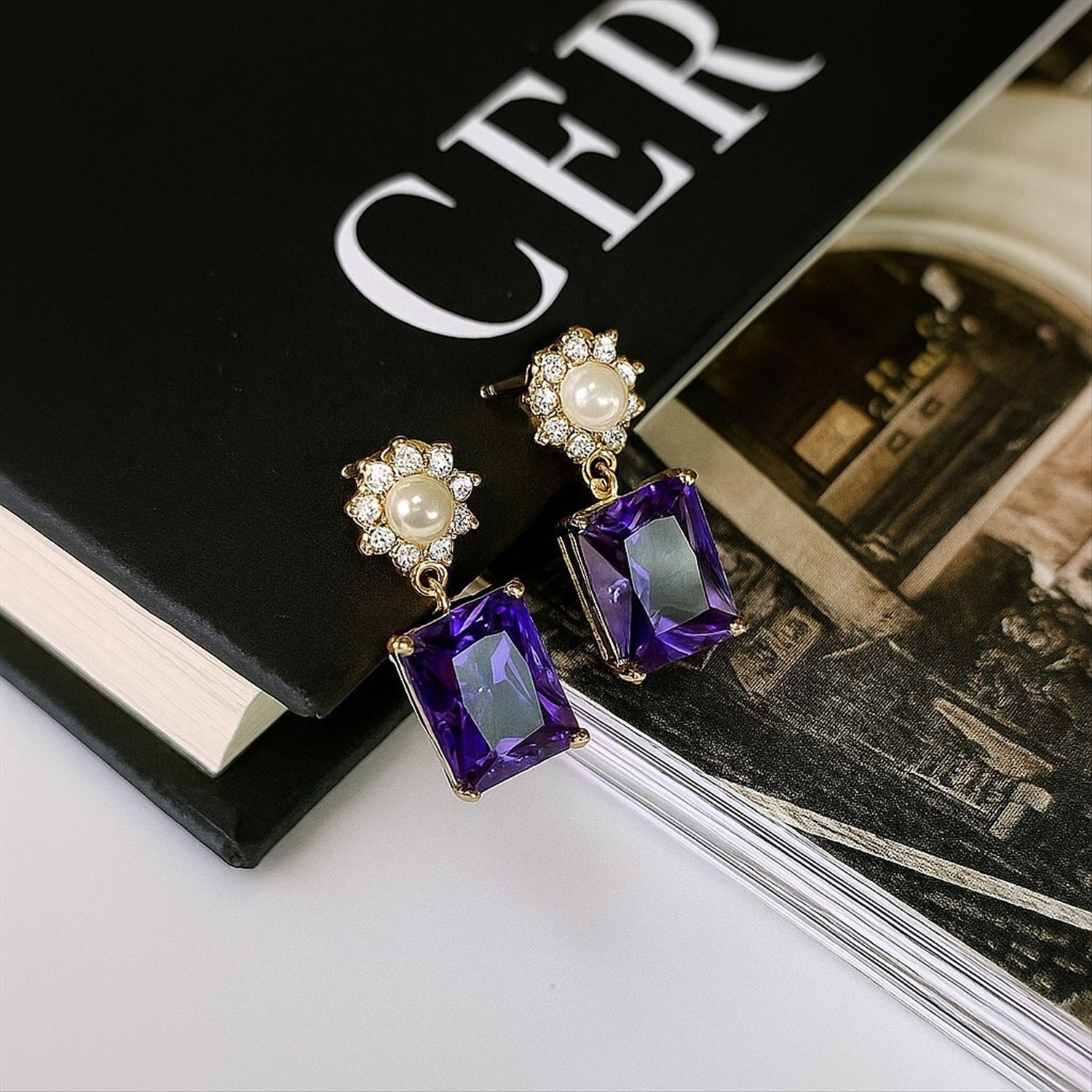 Серьги ювелирная бижутерия коллекция "Дубай" покрытие позолота, вставка: фианиты и искусственный жемчуг, цвет: фиолетовый и жемчужный, арт.007.166
