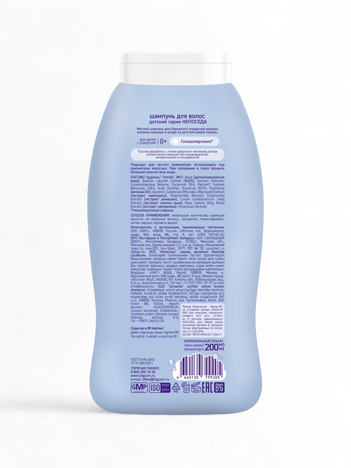 Габариты: 15,5 x 7,5 x 3,5 Страна: Россия В боксе: 8 шт Состав: См. на упаковке Материалы: см. на упаковке Фасовка: по 1 шт Индивидуальная упаковка: Без упаковки Сертификат: ЕАС Для кого: Унисекс Объём, мл: 200 Аромат: Свежесть Тип волос: Для всех типов Эффект: Очищение Вид шампуня: Жидкий Мягкий шампунь с календулой и ромашкой Непоседа создан специально для ухода за первыми локонами и нежной кожей головы новорожденных. Не сожержит SLS, парабены, метилы, красители и аллергены. Благодаря Д-пантенолу и комплексу натуральных экстрактов ромашки и календулы, мягкий шампунь не только бережно очищает нежные волосы и кожу, но так же обеспечивает увлажнение и питание кожи и волос, способствует снятию сухости и раздражений. Состав разработан с учетом сведения к минимуму рисков аллергических реакций при индивидуальной непереносимости ингредиентов. Способ применения: нанести на влажные волосы, помассировать до образования пены, затем хорошо смыть водой. При необходимости процедуру повторить. Подходит для ежедневного применения. Аромат: нейтральный аромат детской косметики. Состав: Aqua (деионизированная вода), Sodium Laureth Sulfate (SLES), Sodium Chloride, Cocamidopropyl Betaine, Cocamide DEA, Parfum, Sodium Benzoate, Citric Acid, Sorbitol, Disodium EDTA, Panthenol (Витамин В5), Glycerin, Calendula Оfficinalis (Marigold) Extract (экстракт календулы), Chamomilla Recutita (Camomile) Extract (экстракт ромашки), Linum Usitatissimum Seed Extract (экстракт семени льна), Rosa Canina (Dog Rose) Еxtract (экстракт шиповника), Potassium Sorbate. Условия хранения: Условия хранения: Хранить в сухом прохладном месте при температуре от 0 до +25 градусов. Цельсия и относительной влажности воздуха не более 70%. Комментарии к товару
