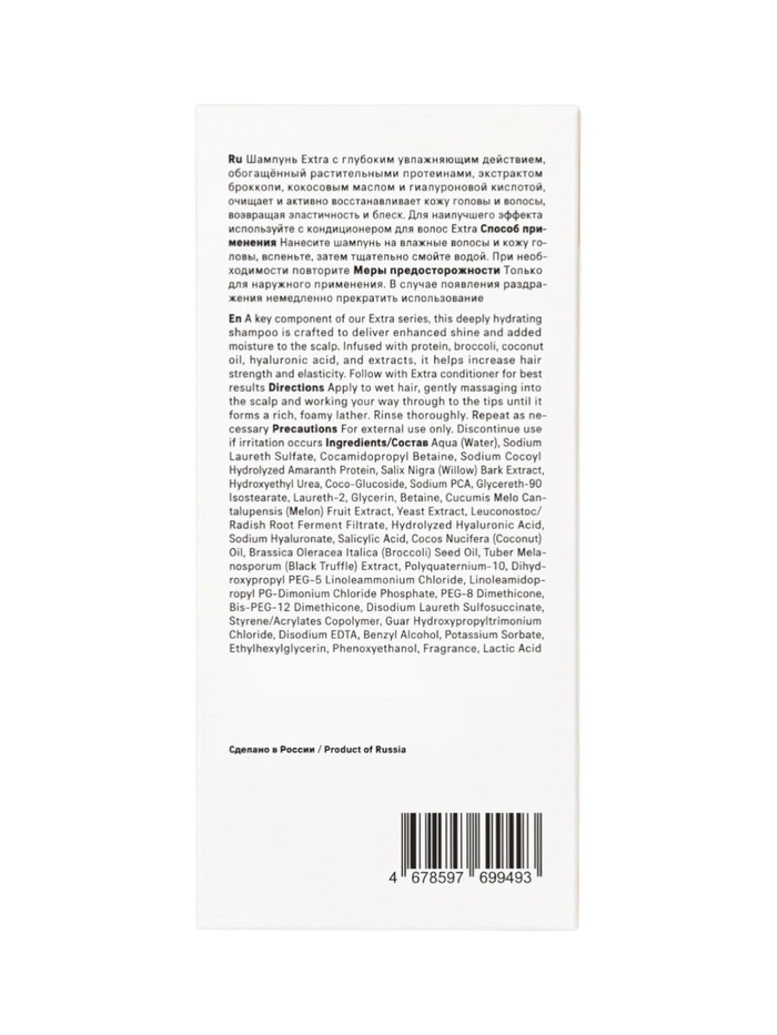 Экстракты коры чёрной ивы, дыни и трюфеля обладают антиоксидантным действием, защищают волосы от внешних стресс-факторов, уменьшают ломкость и повышают устойчивость к повреждениям. Гидролизованная гиалуроновая кислота и гиалуронат натрия глубоко увлажняют волосы и кожу головы, поддерживая оптимальный уровень влаги и способствуя восстановлению естественного баланса.