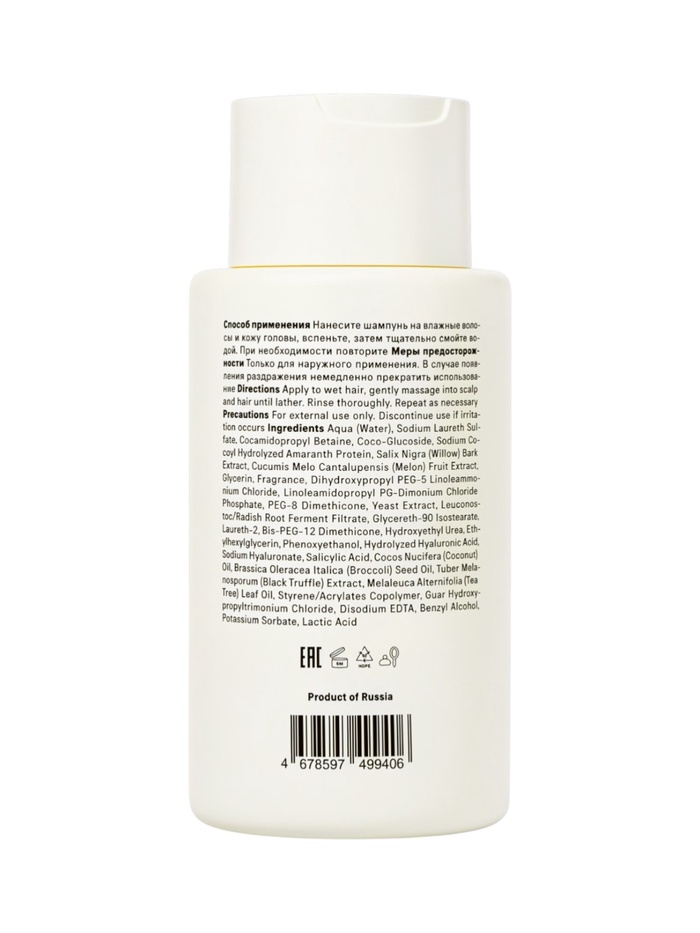 Вода, лауретсульфат натрия, кокамидопропилбетаин, коко-глюкозид, натрия кокоил гидролизованного амарантового белка, экстракт коры чёрной ивы, экстракт дыни, глицерин, отдушка, дигидроксипропил ПЭГ-5 линолеаммониум хлорид, линоламидопропил ПГ-димониум хлорид фосфат, ПЭГ-8 диметикон, экстракт дрожжей, лейконосток/ферментированный фильтрат корня редиса, ПЭГ-90 глицерил изостеарат, лаурет-2, бис-ПЭГ-12 диметикон, гидроксиэтил мочевина, этилгексилглицерин, феноксиэтанол, гидролизованная гиалуроновая кислота, гиалуронат натрия, салициловая кислота, масло кокоса, масло брокколи, экстракт черного трюфеля, масло чайного дерева, стирен/акрилат сополимер, гуар гидроксипропилтримония хлорид, динатрий ЭДТА, бензиловый спирт, сорбат калия, молочная кислота.