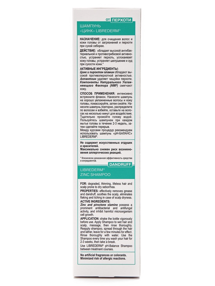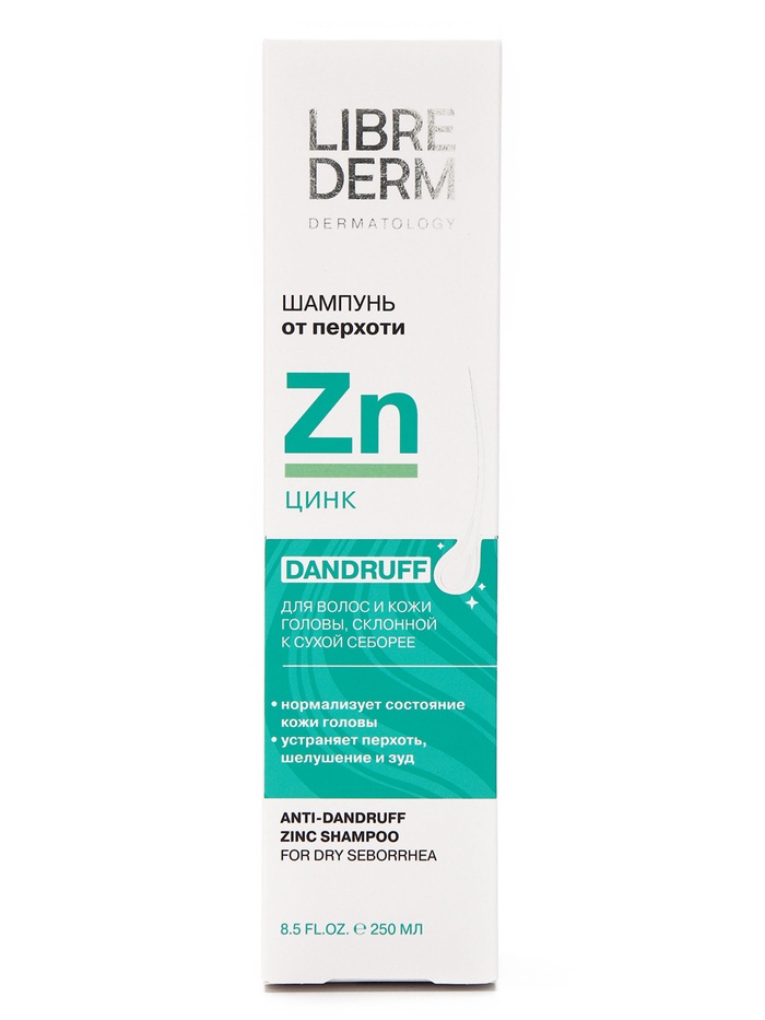 Шампунь ЦИНК предназначен от перхоти при сухой коже головы. Эффективно очищает кожу головы и волосы, отшелушивает ороговевшие чешуйки, уменьшает гиперкератоз, нормализует выработку кожного сала, способствует быстрому устранению симптомов сухой себореи, устраняет зуд и жжение, успокаивает кожу головы. Пиритион цинка оказывает противомикробное, бактериостатическое и фунгицидное действие. Д-Пантенол и аллантоин в составе оказывают увлажняющее и успокаивающее действие.