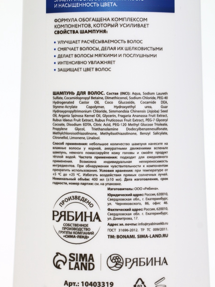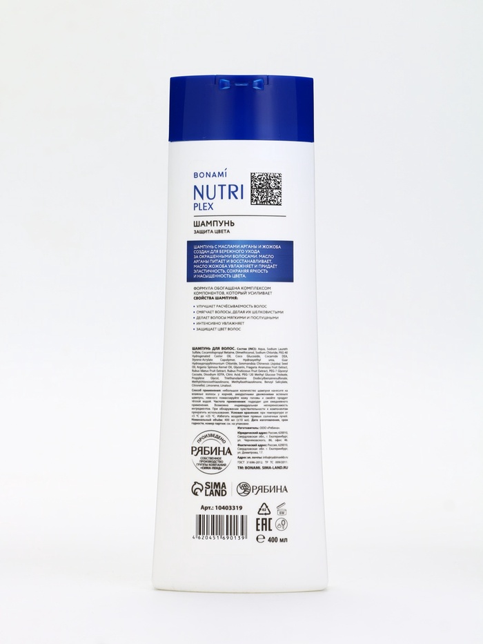 Габариты: 4,5 x 7,5 x 22,5 Страна: Россия В боксе: 21 шт Состав: См. на упаковке Материалы: см. на упаковке Фасовка: по 1 шт Индивидуальная упаковка: Без упаковки Сертификат: ЕАС Набор: Нет Для кого: Для женщины Вес, г/Объём, мл: 400 Объём, мл: 400 Тематика праздника: Универсальная тематика Адресат: Без адресата Возраст: Для взрослых Тип волос: Для всех типов Эффект: Защита цвета Вид шампуня: Жидкий Комментарии к товару