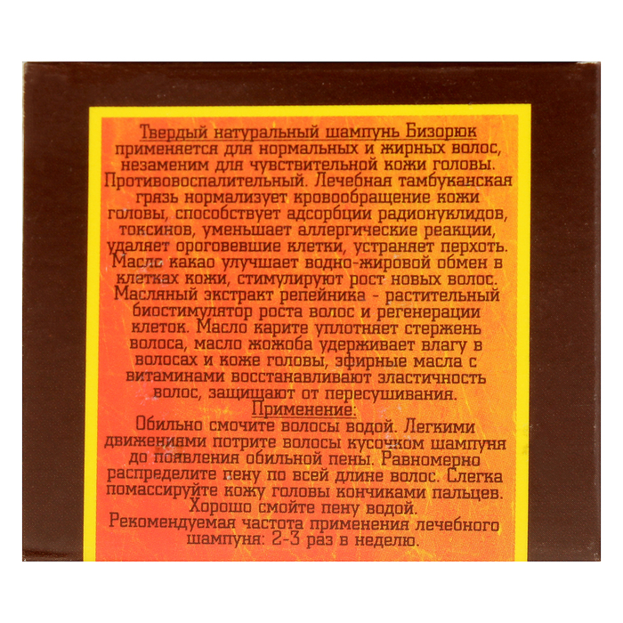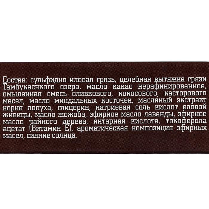 Состав: сульфидно-иловая лечебная грязь озера Тамбукан, масло какао нерафинированное, омыленная смесь оливкового, кокосового, касторового и масла миндальных косточек, масляный экстракт корней лопуха, глицерин, натриевая соль кислот еловой живицы, масло жожоба, эфирное масло лаванды, эфирное масло чайного дерева, янтарная кислота, токоферола ацетат (витамин Е). Средство не содержит синтетических отдушек, красителей, консервантов. Рекомендуемая частота применения лечебного шампуня: 2–3 раза в неделю. Комментарии к товару
