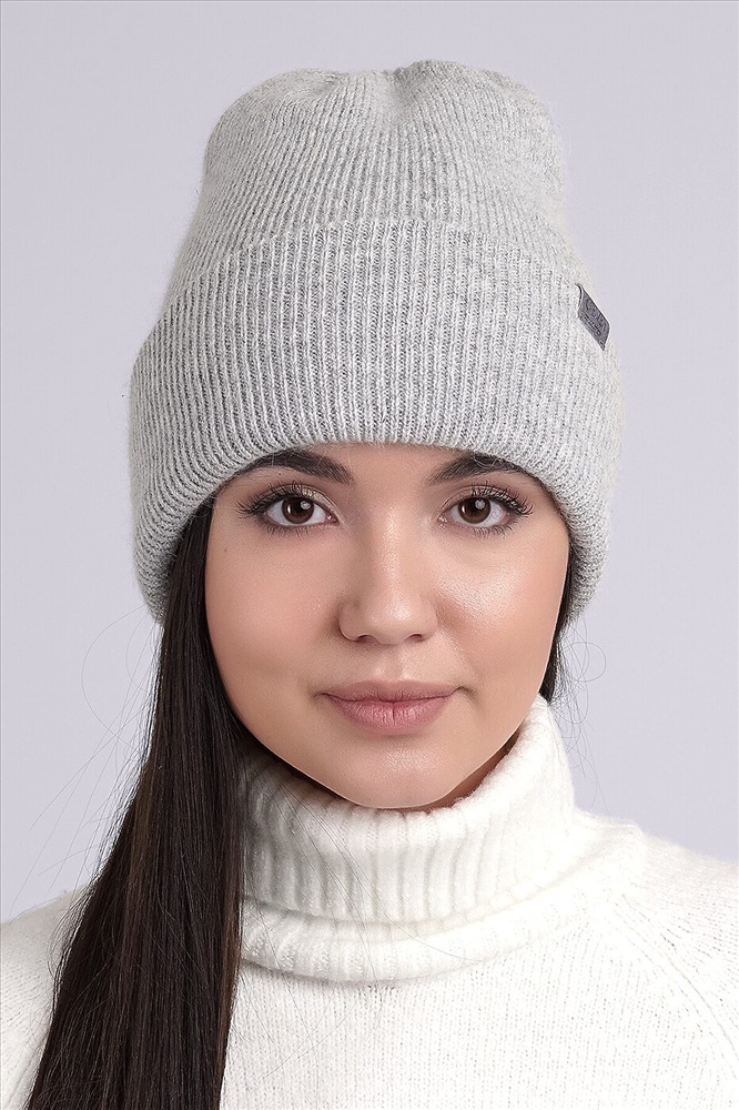 Женская шапка двойная, декорированная кожаной нашивкой. Подойдет для холодной зимы
