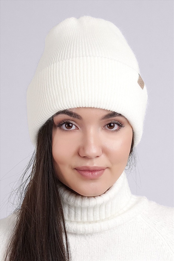 Женская шапка двойная, декорированная кожаной нашивкой. Подойдет для холодной зимы