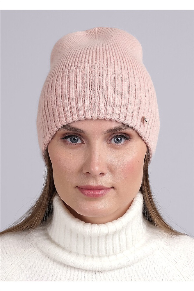 Женская двойная шапка, декорирована нашивкой логотип. Отлично подойдёт для зимы.