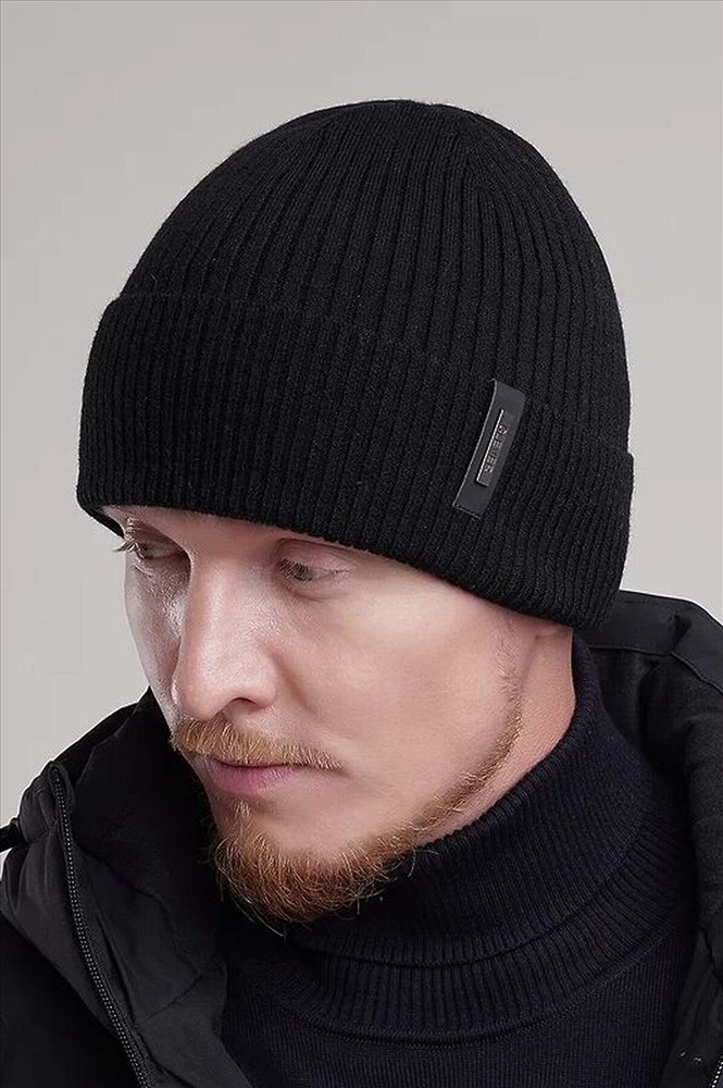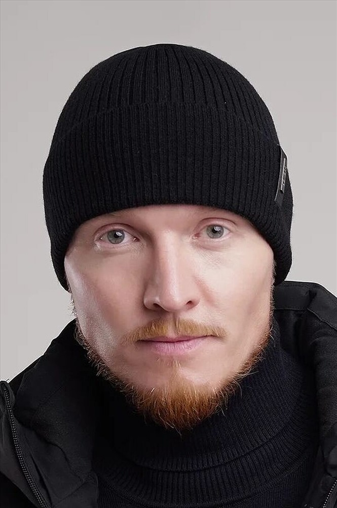 Шапка мужская с отворотом, с подкладом из флиса. Выполнена из высококачественной пряжи, декорирована стильной нашивкой. Станет не только отличной защитой от холода, но и модным аксессуаром.