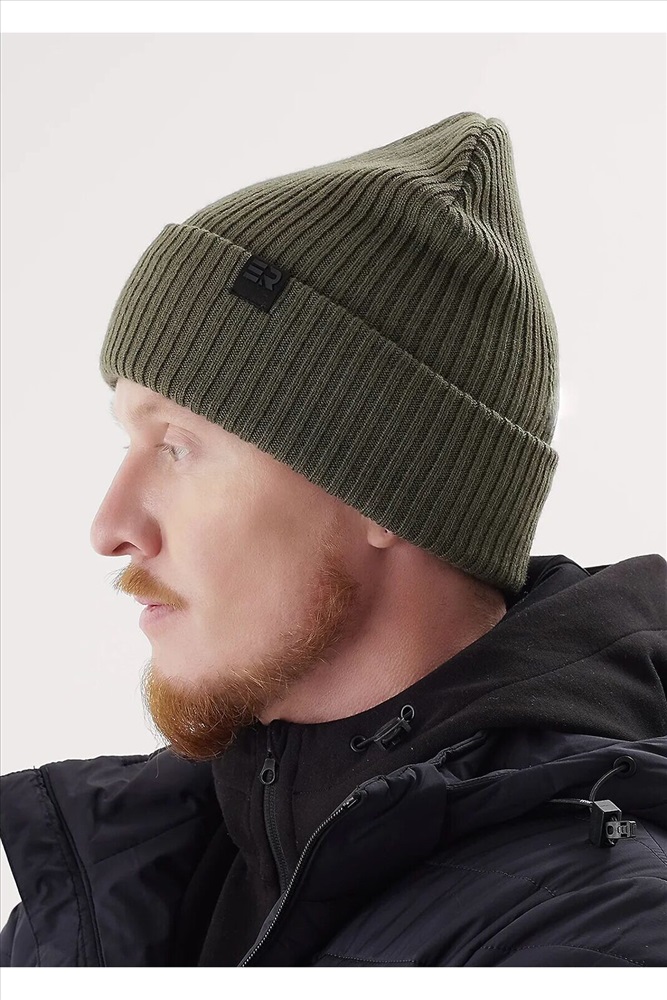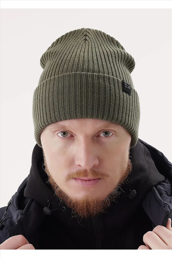 Мужская шапка с отворотом выполнена из высококачественной пряжи с добавлением шерсти, декорирована логотипом- нашивкой.