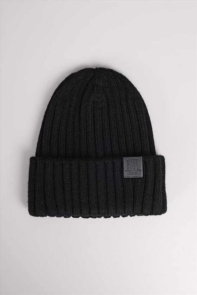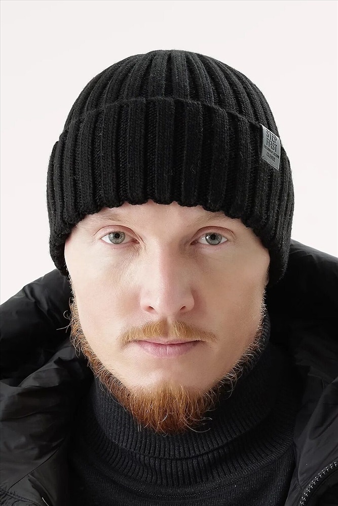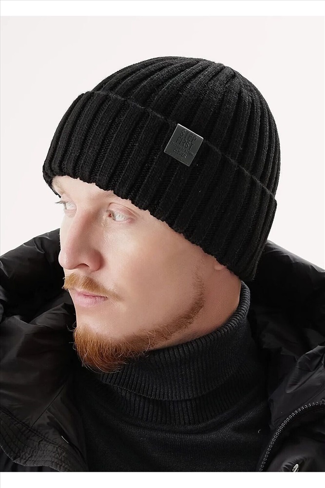 Мужская шапка из скрученой пряжи с отворотом, декорирована стильной нашивкой- логотип. Идеально подойдёт для холодной осени, тёплой зимы.