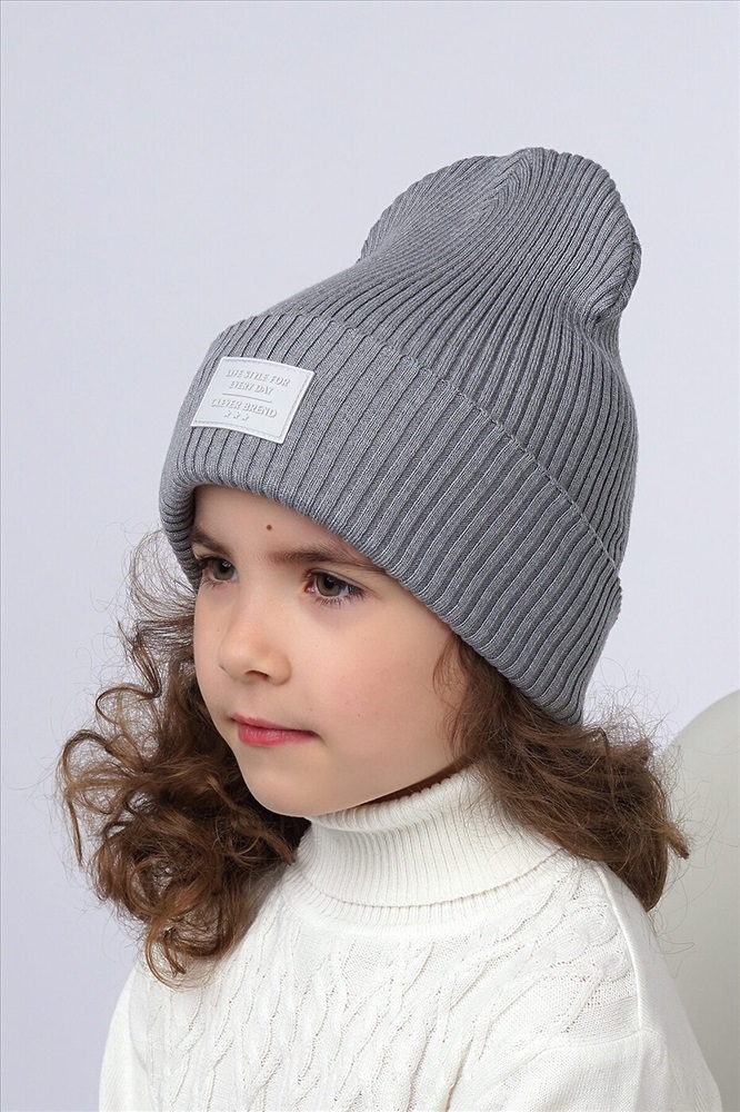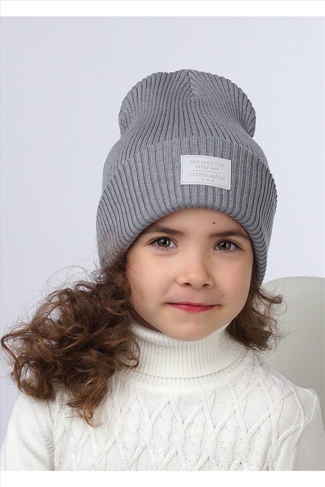 Стильная детская двойная шапка с отворотом, связанная ластичным переплетением, декорирована силиконовой нашивкой в центре.