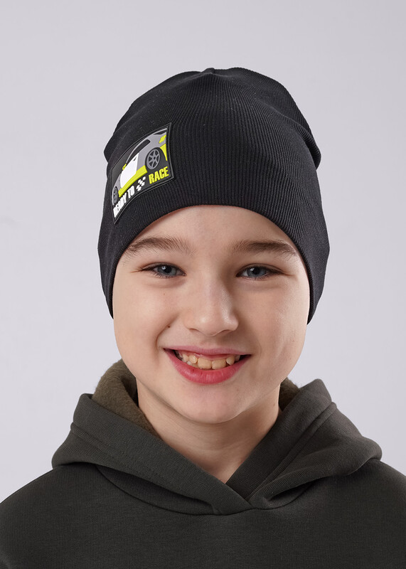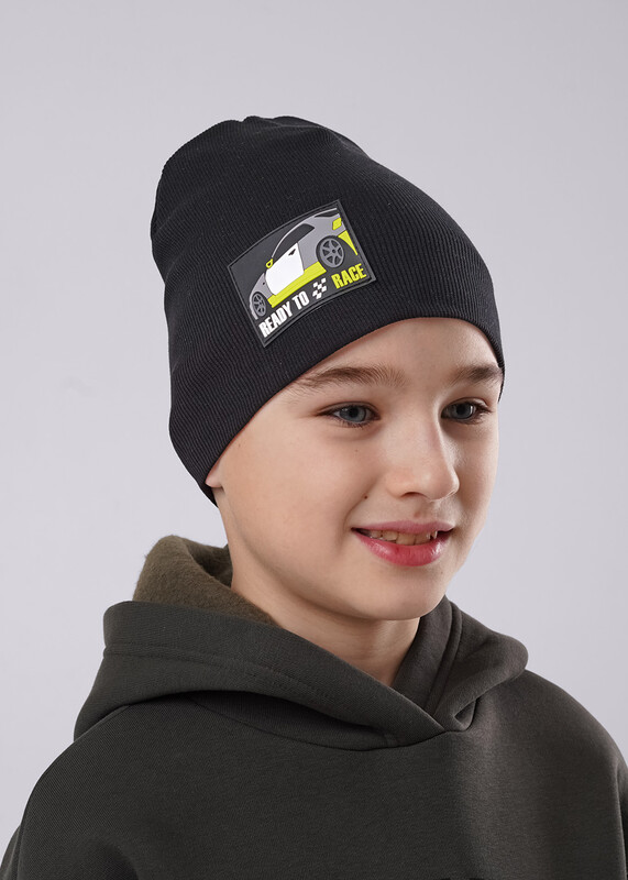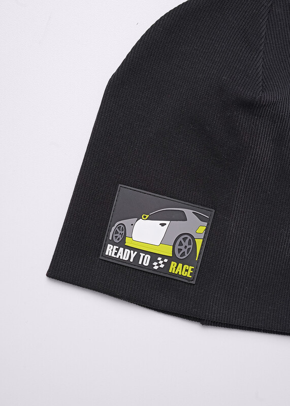 Шапка детская двойная без отворота, декорирована стильной нашивкой. Изготовлена из хлопка. Размер 52-54
