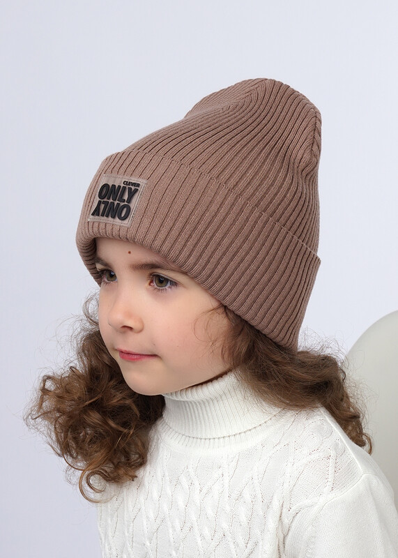 Стильная детская двойная шапка с отворотом, связаная ластичным переплетением, декорирована силиконовой нашивкой в центре.