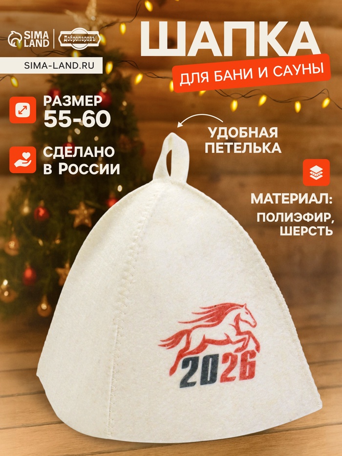 Габариты: 20 x 1 x 25 Доставка: Платная Страна: Россия В боксе: 100 шт Состав: Шерсть, полиэфирное волокно Материалы: шерсть, полиэфирное волокно Фасовка: по 1 шт Индивидуальная упаковка: Без упаковки Сертификат: Не подлежит сертификации Цвет: Белый Для кого: Унисекс, Для женщины, Для мужчины Размер: 55, 56, 57, 58, 59, 60 Символ года: Символ года 2026 (Лошадь) Тематика праздника: Новый год Материал: Шерсть, Полиэфир Тип рисунка: Принт Содержание шерсти: 30% Вид шапки: С рисунком Цвет: Светлая Шапка для бани «Год лошади» от «Добропаровъ» — это аксессуар, созданный для настоящих ценителей русской бани и финской сауны. Сочетание натуральной шерсти и прочного полиэфира обеспечивает надежную защиту и долговечность.
