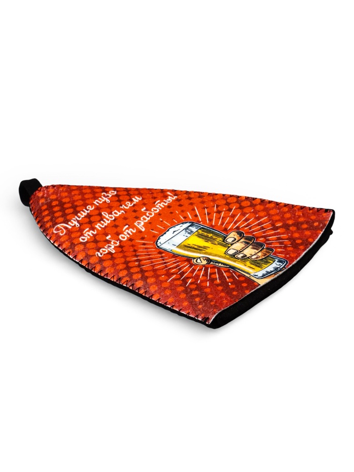 - Интересный принт: рисунок с кружкой пива и надписью делает аксессуар заметным элементом банного набора.