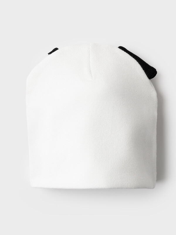 Детская трикотажная шапка для девочки. Модель из плотного вязаного трикотажа одинарной вязки с декоративным оформлением в виде мордочки щенка. На лицевой стороне шапки — выразительная аппликация: глаза, нос и ухо щенка. По бокам пришиты декоративные «ушки», имитирующие ушки животного. Низ шапки оформлен аккуратным подворотом, что улучшает посадку.