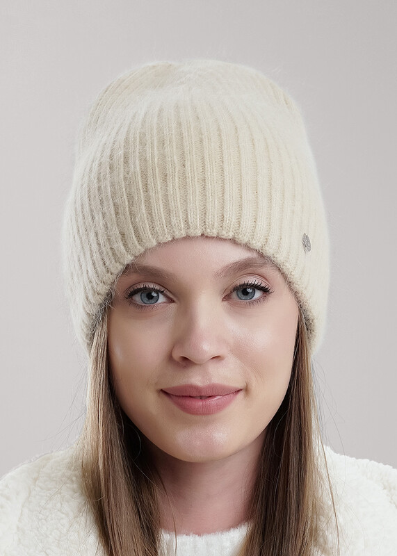 Женская двойная шапка без отворота, связаная ластичным переплетением, выполнена из пряжи с содержанием высококачественной ангоры.